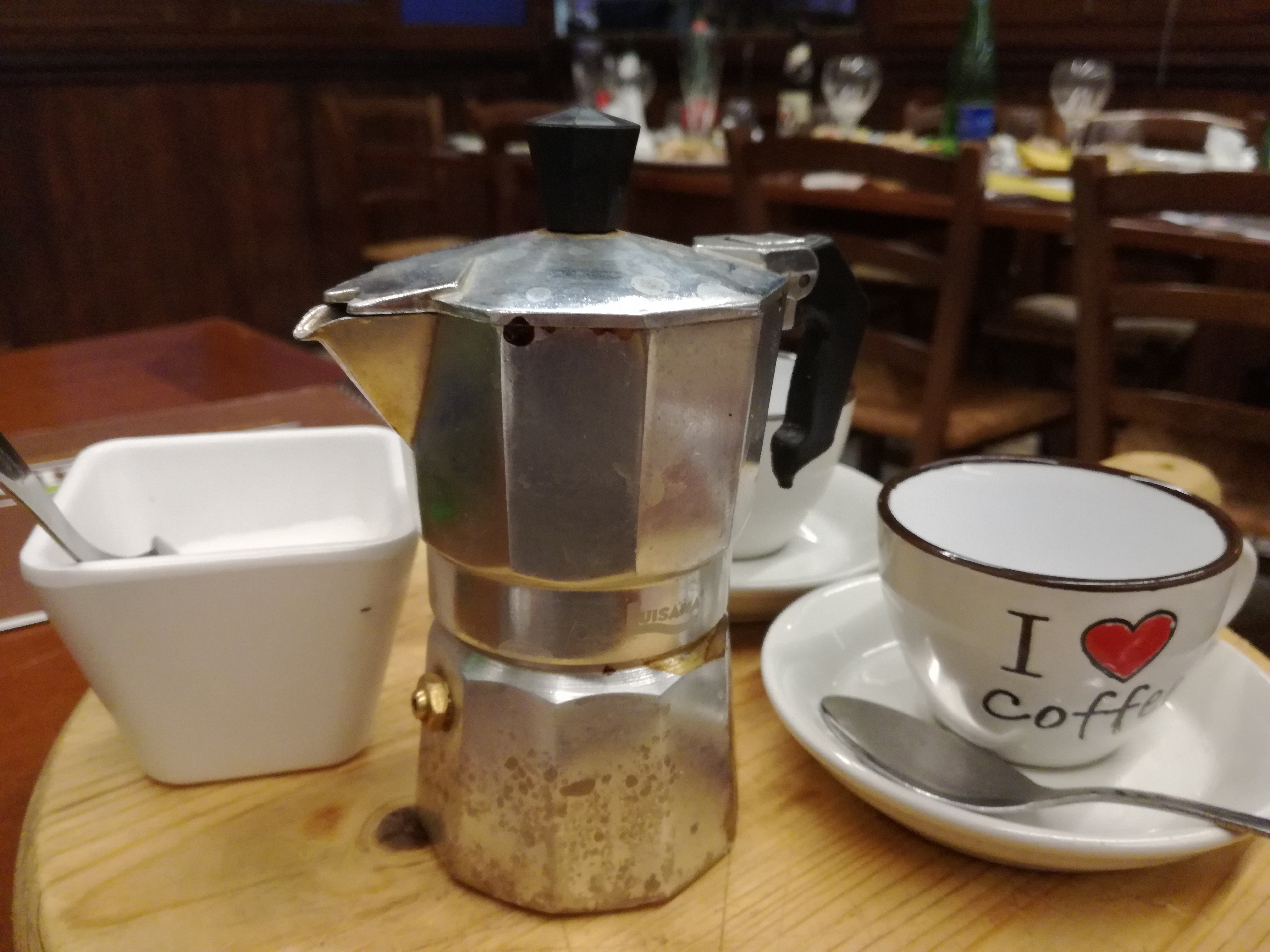 E quando pensi ora c’vuless nu bellu cafè, ecco materializzarsi la moka bollente con la zuccheriera e le tazzine con i cuoricini, che simili alle scocche rosse di Heidi e alle candide caprette, mi sorridono e mi fanno: “Ciao, ritorna“.