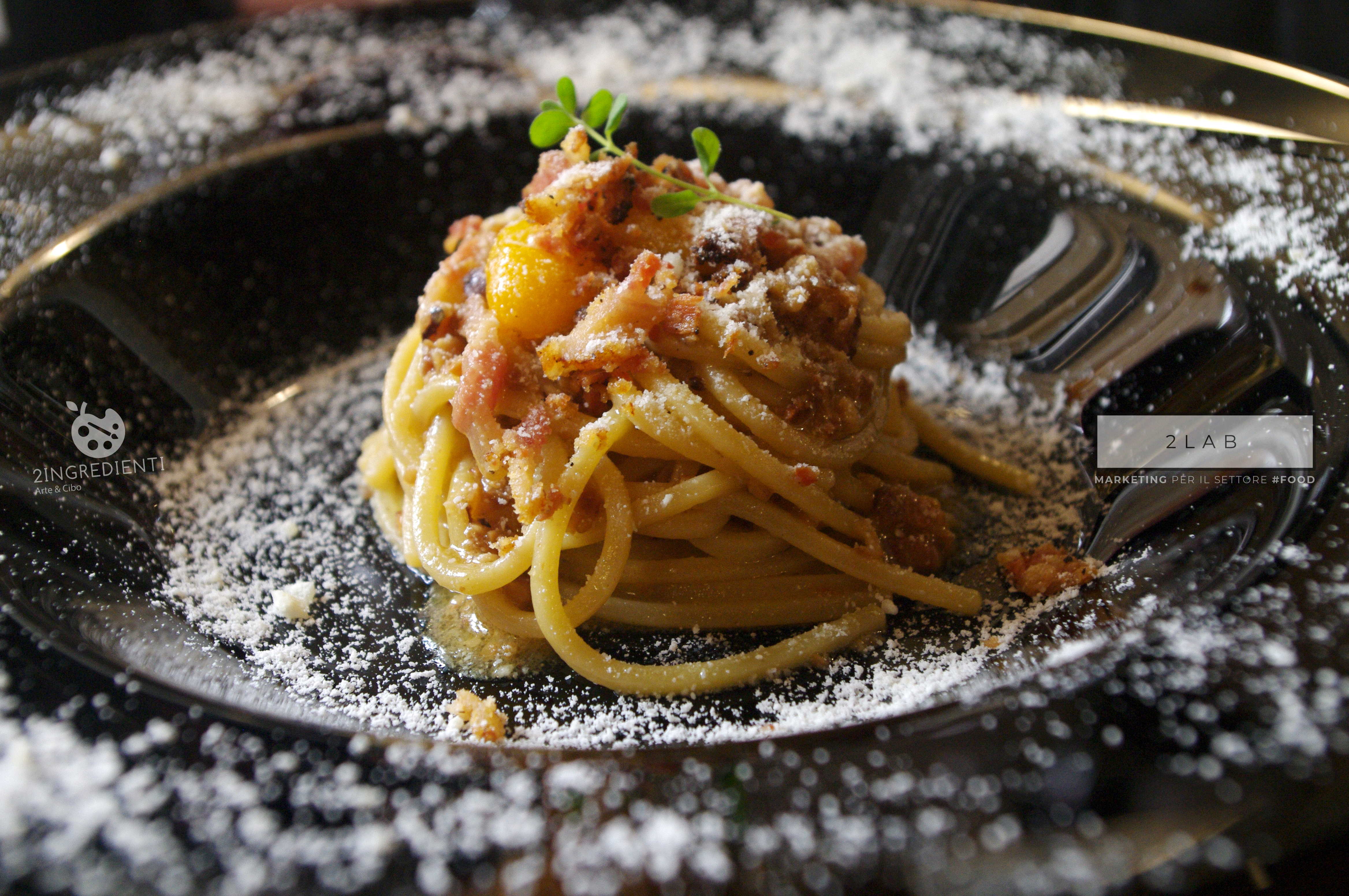 Il vino è stato abbinato ad una spaghetto alla chitarra artigianale con pomodorino giallo del Vesuvio, granella di nocciole di Giffoni IGP, guanciale di Norcia e pecorino locale grattugiato. Questo piatto è senza ombra di dubbio il cavallo di battaglia del locale, nato da un’idea di Carlo che ha rivisitato una ricetta testata durante uno dei suoi numerosi viaggi in giro per il mondo. Leggermente sapido ha saputo in ogni caso conquistare l’applauso finale.
