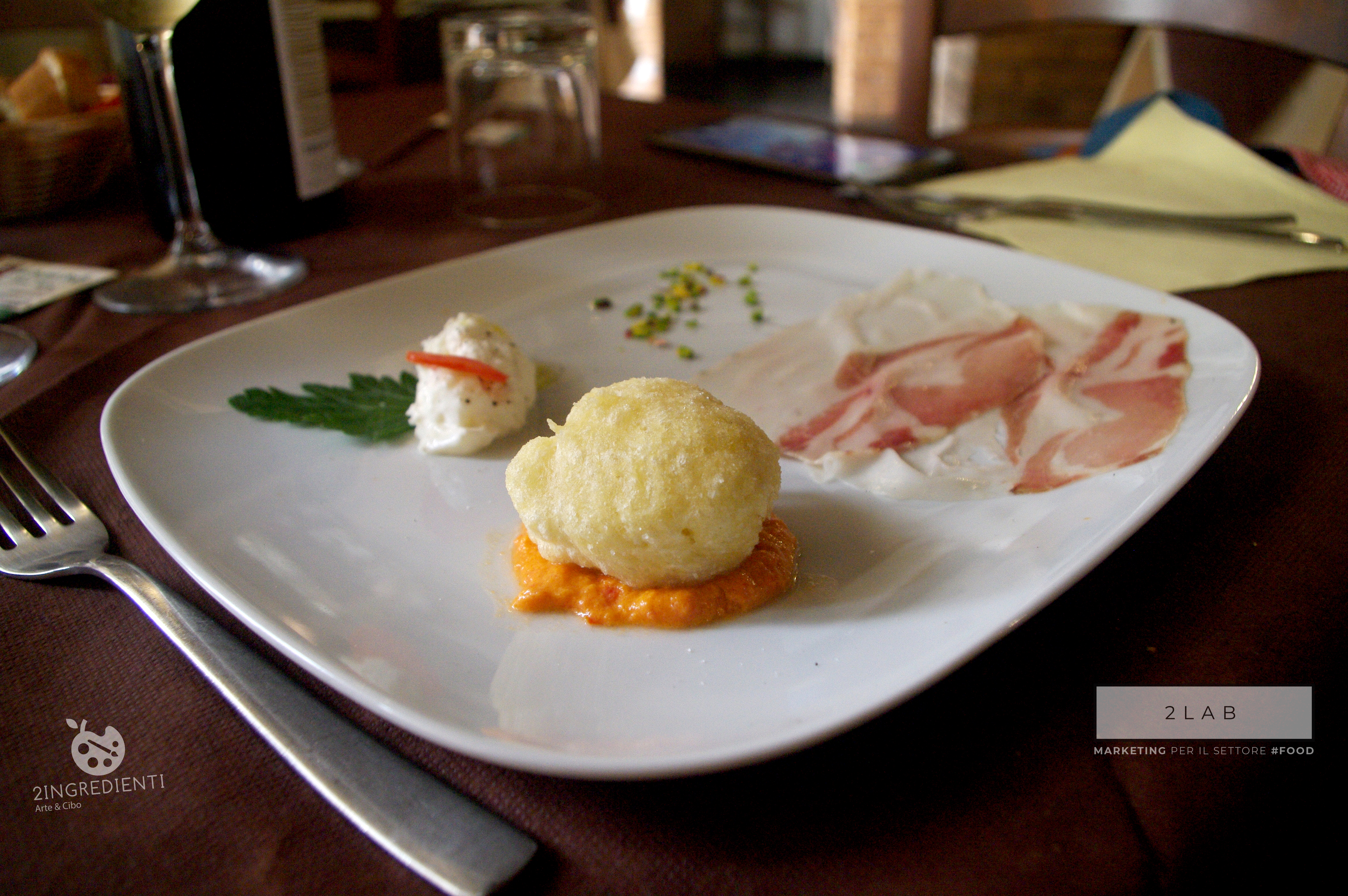 Il secondo antipasto ha previsto una quenelle di candida burrata pugliese condita con pepe e olio extravergine d’oliva colline salernitane DOP, una frittellina di pasta cresciuta su gremolada di pomodori da insalata ed eccellente lonzarda della medesima razza di maiale dal gusto pieno e avvolgente e di colore rosato compatto e uniforme, sostenuto dal filetto di lardo bianco con striature anch’esse rosate.