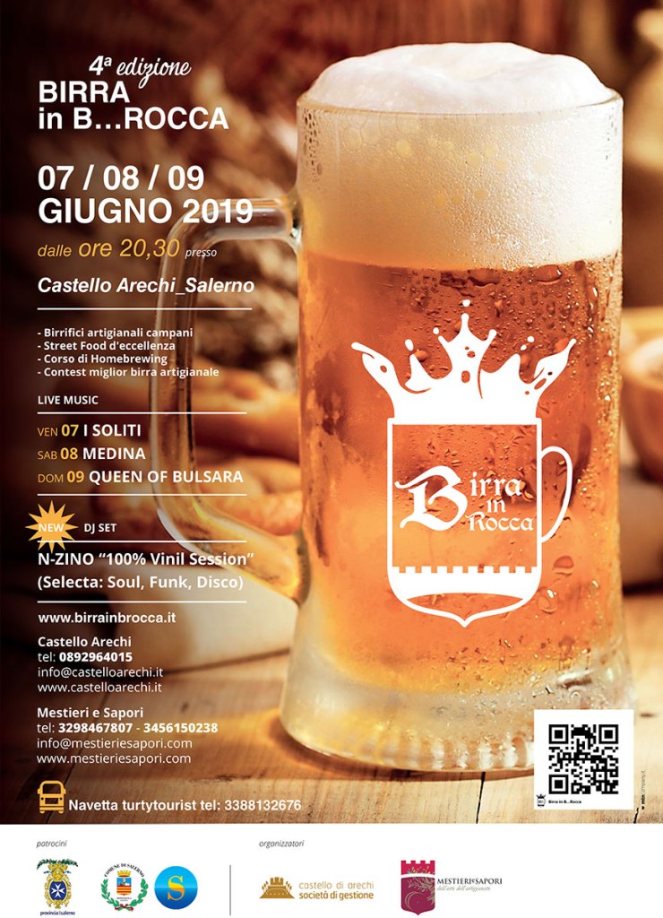 Riconfermati, invece, il momento formativo col corso di Homebrewing nelle sale interne e la competizione destinata a premiare la miglior birra della manifestazione, con in palio una pregiata brocca artigianale realizzata dall’azienda “Ceramichelle di Paola e Natale”. Servizio navetta a cura di Turty Tourist (3388132676). Apertura stand ogni sera dalle ore 20:30. Birra in B…Rocca 2019 gode del patrocinio del Comune di Salerno e della Provincia di Salerno.