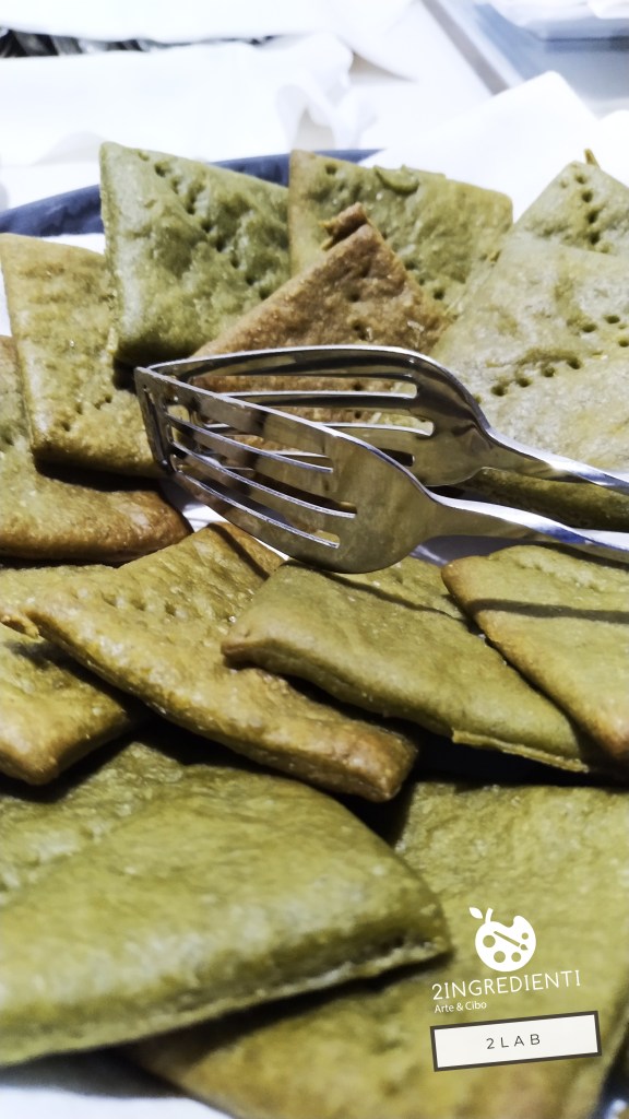 Un fantastico cocktail pre dinner è stato servito come aperitivo, per stimolare la salivazione e, di conseguenza, l’appetito. Una rivisitazione del conosciuto Bloody Mary in chiave marina intitolata “Sea Bloody Mary” con acqua di mare, acqua di pomodoro cuore di bue, gin mare, worcestershire sauce, tabasco, cenere di rosmarino, timo fresco e come stuzzichino un biscotto di parmigiano e polvere di alga spirulina. Sentori salini e freschezza sono immediatamente arrivati in bocca; le note fredde sono state mitigate da quelle più calde e avvolgenti dei crackers dalle verdi sfumature.