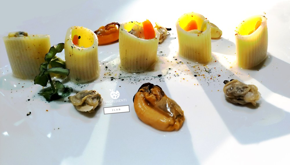 “Sensazioni di salsedine”, composizione al piatto con mezzi paccheri rigati freddi del Pastificio Fabbrica della Pasta di Gragnano, olio all’acqua di vongole, maionese di frutti di mare e alghe, frutti di mare aperti in purezza a 80 gradi, crudo di frutti di mare, si è potuta descrivere come oceani, insenature, scogliere, fiordi, burrasche, spiagge selvagge. Oltre a presentarsi come un piccolo capolavoro di food design, questo primo ha dato modo allo chef di chiarire ai presenti la sua idea di cucina-sogno: “Amo i colori e i profumi di terre lontane. Ma soprattutto prediligo il bello nei piatti, e dentro di esso, ogni giorno, ogni istante in cui cucina, c’è il desiderio, nei percorsi che disegno, che la mente e gli occhi del commensale, si innamorino della mia ricetta dando lo start up all’estasi dell’assaggio“.