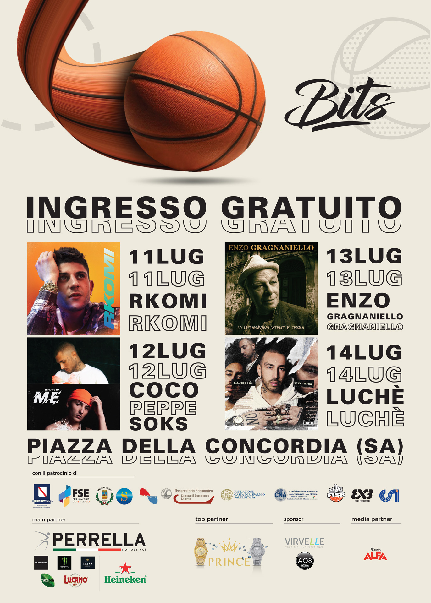Partendo da una formula consolidata, a cui si aggiungono tante novità, ritorna il BITS Festival, il primo Street Festival 100% gratuito, giunto alla VII edizione, in programma dall’11 al 14 Luglio, nella cornice di Piazza della Concordia, a Salerno. Organizzata dall’associazione BITS Onlus, da un’idea di Flavio Donatantonio, Giuseppe Giannattasio, Gianluca Memoli, grazie al sostegno di FSE Campania, Salerno Mobilità, To Salerno, Camera di Commercio Salerno, Fondazione Carisal, CNA Salerno, FISB e CSI Centro Sportivo Italiano, la kermesse gode del patrocinio del Comune di Salerno ed è promossa dalla Regione Campania Assessorato Pari Opportunità e Formazione.