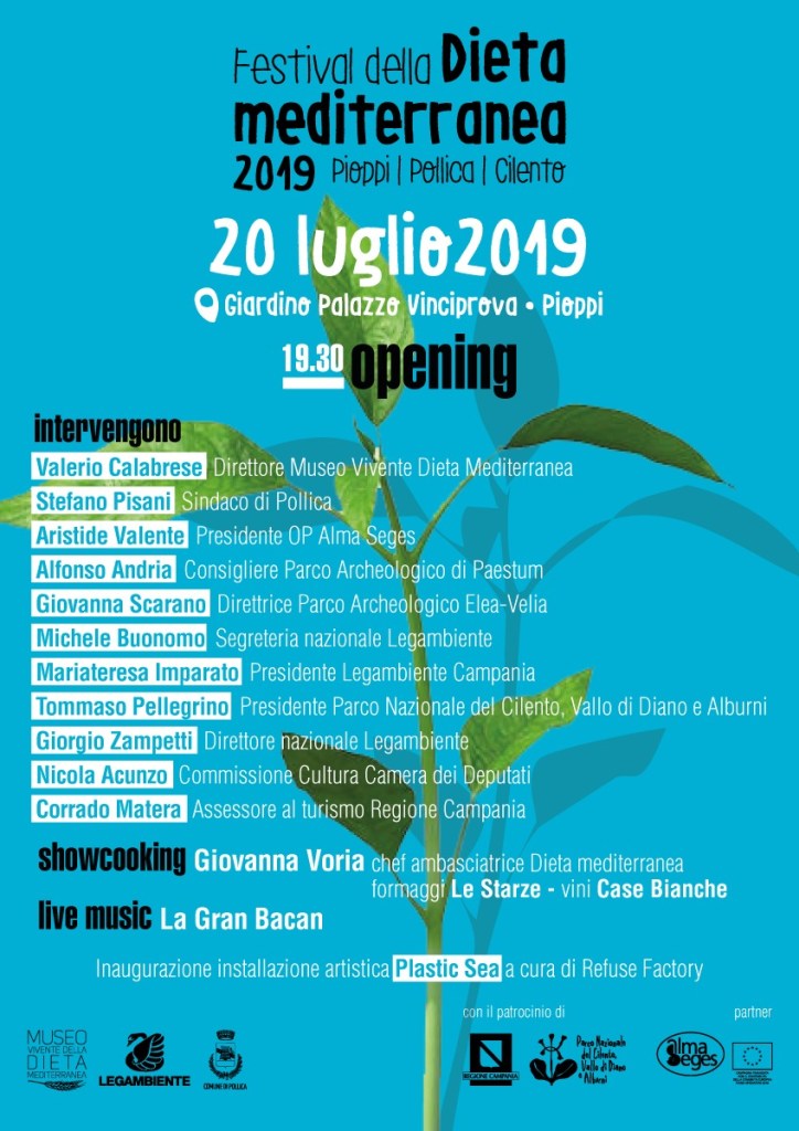Si rinnova per il quarto anno consecutivo l’evento più lungo dell’estate cilentana. Dal 20 luglio all’8 settembre torna il Festival della Dieta Mediterranea di Pioppi, promosso dal Museo Vivente della Dieta Mediterranea, da Legambiente e dal Comune di Pollica. L’inaugurazione si terrà sabato 20 luglio alle ore 19.30 presso il giardino del Palazzo Vinciprova, sede del Museo dedicato alla Dieta mediterranea e del Museo Vivo del Mare.