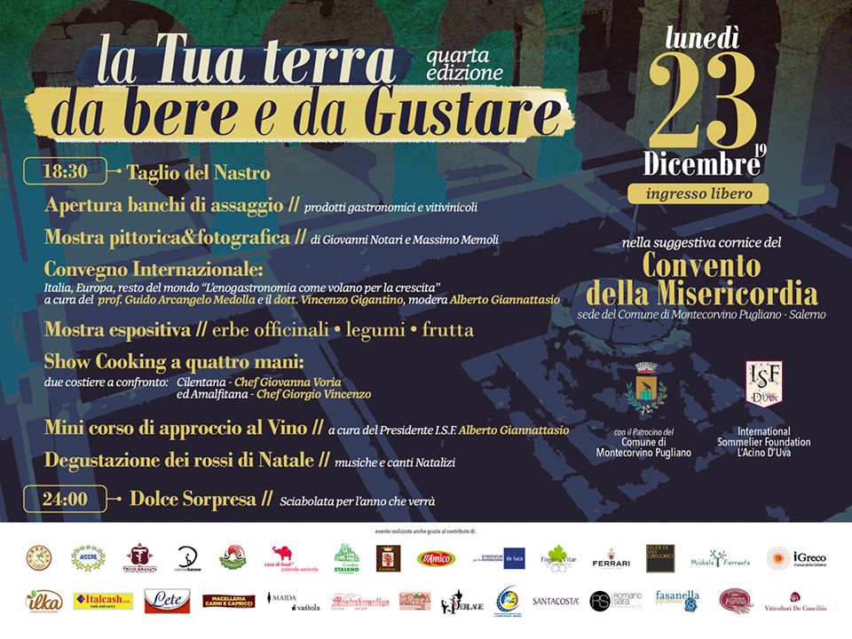 Lunedì 23 dicembre, nella suggestiva cornice del Convento della Misericordia, sede municipale di Montecorvino Pugliano, si terrà la IV edizione dell’evento “La tua Terra da Bere e da Gustare”, rassegna enogastronomica organizzata da L’Acino d’Uva – lnternational Sommelier Foundation con il patrocinio del Comune di Montecorvino Pugliano (SA).