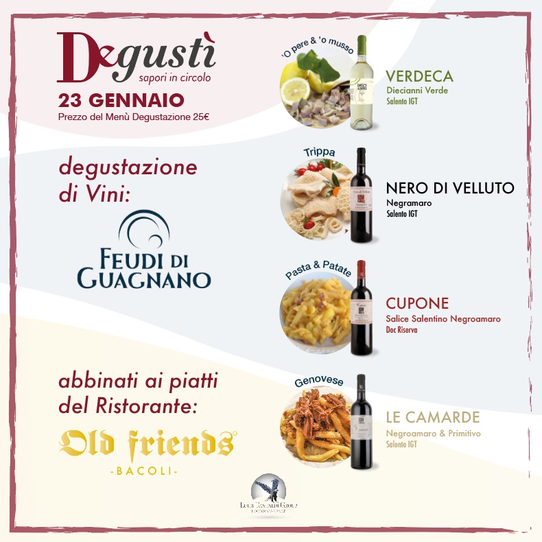 Degustì, il tour degustativo enogastronomico promosso dalla Luigi Castaldi Group, fa tappa presso la steak house “Old Friends”, giovedì 23 gennaio alle ore 20:00 a Bacoli (NA), in via Fusaro 23. Protagonisti del menù degustazione della serata saranno i piatti della tradizione napoletana abbinati ai vini dei Feudi di Guagnano.
