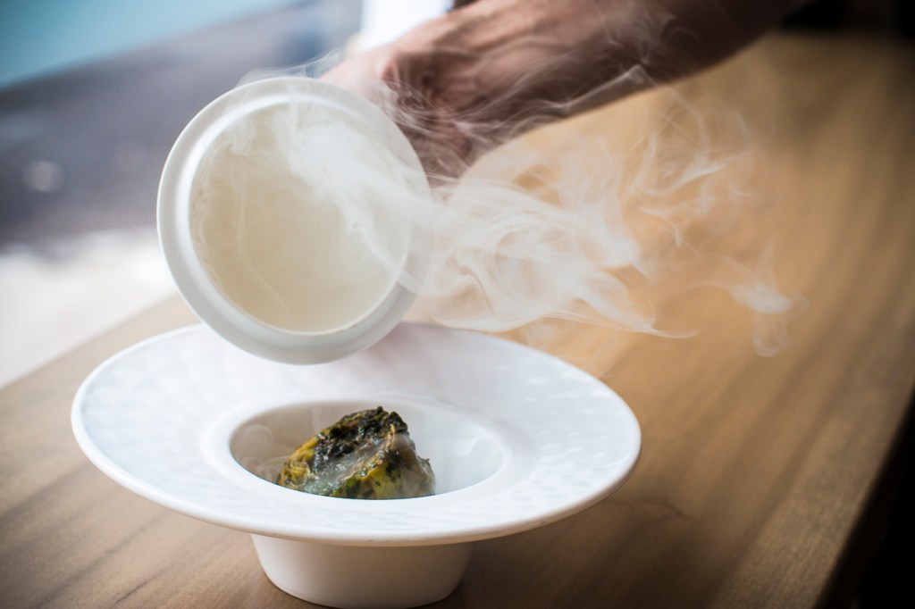 Uovo pochè verdure selvatiche al peperoncino, spuma di caprino e tartare di gambero bianco (Paolo Romeo)