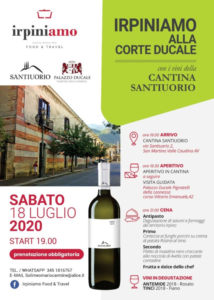 L’evento ha inizio alle ore 19.00 presso la cantina Santiuorio, alle falde della catena montuosa del Partenio, a San Martino Valle Caudina (via Santiuorio n°2) per l’aperitivo di benvenuto con Antemide 2018 – Rosato di aglianico, dopo è prevista la visita alla cantina, piccola realtà agricola di stampo artigianale dedita alla salvaguardia delle varietà autoctone e alla valorizzazione dei vitigni secolari dell’Irpinia.