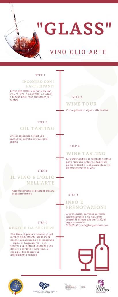 Da un bicchiere trasparente e quindi da un contenitore prezioso escono fuori tre elementi essenziali che uniti si completano a vicenda: il vino, l’olio e la cultura enogastronomica. Infatti giovedì 30 luglio 2020 alle ore 18.00 presso “Le Vigne di Raito” a Vietri sul Mare in Costiera Amalfitana, tre professioniste del settore agroalimentare ed enogastronomico hanno unito le loro forze per dare vita ad una proposta accattivante e stimolante, in previsione della bella stagione estiva e delle attività ricreative da svolgersi all’aperto. Dopo mesi di tribolazioni e preoccupazioni a causa della pandemia da Coronavirus è giunto il momento di promuovere i territori, il turismo anche se di “prossimità”, l’agroalimentare d’eccellenza e la cultura. E quindi Patrizia Malanga titolare dell’azienda agricola biologica Le Vigne di Raito, nonché viticoltrice ed imprenditrice enoica, Maria Manuela Russo titolare dell’azienda olivicola Russo 1979 a Campagna, Vicepresidente dell’Ordine Tecnologi Alimentare Campania-Lazio e Responsabile della Scuola Europea Sommelier Salerno, e Annamaria Parlato giornalista enogastronomica, storica dell’arte e progettista culturale, direttore del Food Blog 2Ingredienti arte&cibo, hanno creato un forte sodalizio e rafforzato la loro amicizia per ideare qualcosa di insolito sul territorio costiero e campano. GLASS sarà un format itinerante campano che si arricchirà strada facendo di collaborazioni con produttori, artisti, chef, pizzaioli, pasticcieri, gelatieri, bartender e sorprese, cambiando sempre la proposta. Giovedì 30 luglio i partecipanti avranno la possibilità di sperimentare nuove forme di turismo esperienziale, emozionale e relazionale e di apprezzare una Costiera insolita. Si inizierà dal wine tour guidato assieme a Patrizia Malanga che farà conoscere in ogni dettaglio le sue incantevoli vigne inondate di sole e mare per godere del panorama mozzafiato e dell’incantevole veduta all’ora del tramonto. Il tour proseguirà in cantina per scoprire tutti i passaggi che intercorrono tra la vinificazione e l’imbottigliamento. Terminato il wine tour si proseguirà con l’oil tasting e quindi con l’analisi sensoriale (olfattiva e gustativa) a cura di Maria Manuela Russo, esperta assaggiatrice di oli di oliva, che presenterà il suo Pascà Oro dal colore giallo oro, profumato e delicato, un fruttato leggero con sentori erbacei e un’inaspettata nota piccante finale. Viene fuori da un blend di frantoio, carpellese, leccino, coratina, FS17, tale da renderlo complesso nella su apparente semplicità. Al naso sentori floreali, ancora freschi di finocchietto e mentuccia, ma anche pungenti di cardo e carciofo. In bocca pomodoro, frutta secca e mela annurca, nel complesso è un prodotto di grande equilibrio dove le predominanti note piccanti non prendono mai il sopravvento. Infine la giornalista enogastronomica Annamaria Parlato allieterà il momento della degustazione di olio e vino assieme ai piatti realizzati da Patrizia Malanga con letture ed approfondimenti relativi alla storia, alla letteratura e all’arte di questi due prodotti emblema della Dieta Mediterranea assieme al grano. Durante il wine tasting ci sarà modo di degustare tre etichette della rinomata azienda vitivinicola in abbinamento a piatti tipici.