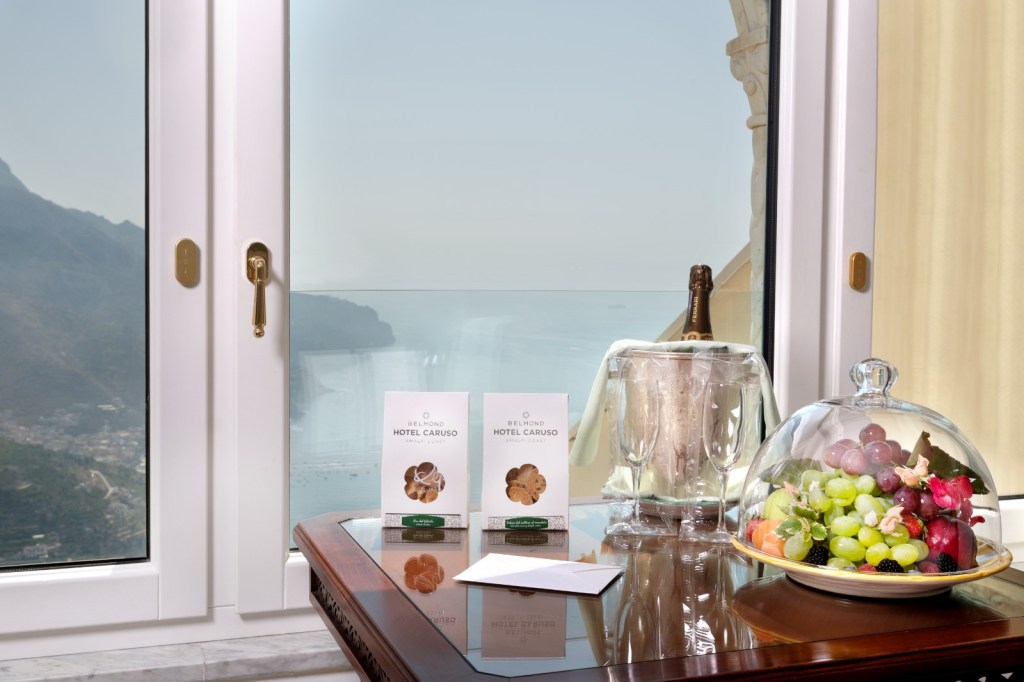 Il Belmond Hotel Caruso è universalmente riconosciuto come un polo di eccellenza dell’ospitalità ad altissimo livello in Costiera Amalfitana, e la linea di amenities firmata da Pepe Mastro Dolciere in esclusiva per il Belmond Hotel Caruso, esprime la quintessenza dell’arte pasticcera italiana. E’ composta sia da amenities per il minibar che per il welcome in camera: i babà in vasocottura da 80gr al rhum e al limoncello, le cortecce alle mandorle con cioccolato bianco aromatizzato al limone e all’arancia, sono disponibili nel minibar; mentre il biscotto “Pan del Cilento”, realizzato con pinoli e fichi bianchi proveniente dal Parco Nazionale del Cilento e Vallo di Diano, ed il biscotto “Delizia del mattino”, realizzato con finissimo cioccolato al latte, sono disponibili per il benvenuto.
