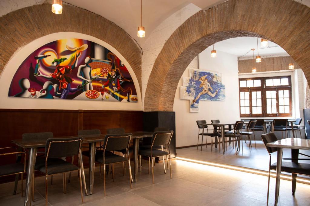 I piatti – come i centrotavola ed i quadri affissi – sono pezzi unici realizzati da artisti di prestigio internazionale. Antonio Nocera, scultore napoletano di fama mondiale, ha fatto conoscere i suoi pulcinella in tutto il mondo; Marco Ferrigno, artista storico di San Gregorio Armeno, Maestro della tradizione pastorale napoletana; Mark Kostabi, pittore e compositore statunitense, opera a New York ed è conosciuto per le sue opere oltre che per copertine musicali che hanno fatto la storia. Inoltre una cucina a vista lascerà ammirare sempre i pizzaioli a lavoro.