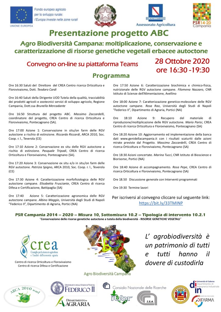 Durante l’incontro organizzato dal Crea (Centro di Ricerca Orticoltura e Florovivaismo di Pontecagnano) capofila del progetto, insieme ai partner Arca 2010, CNR, Unina e Unisa, si illustreranno i principali obiettivi del progetto che sono quelli di mettere in sicurezza e aumentare le conoscenze sulle RGV (Risorse Genetiche Vegetali) delle cosiddette “erbacee campane”, assicurando la loro moltiplicazione e conservazione, così come la caratterizzazione a più livelli delle varietà locali più diffuse e che sono oggetto di percorsi di valorizzazione.