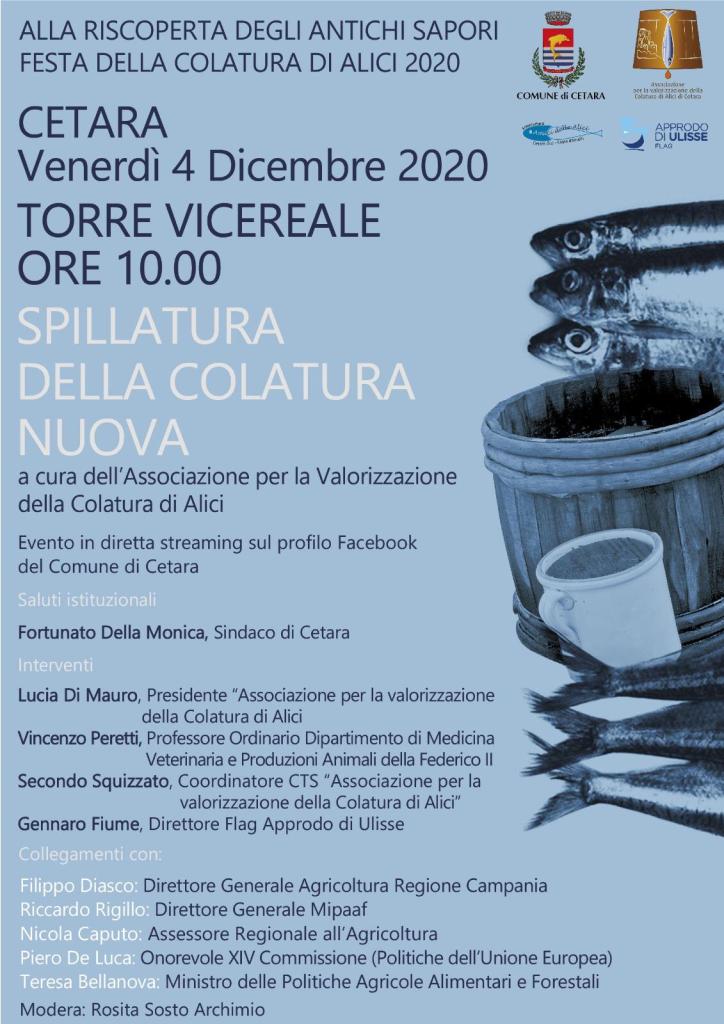 Dopo i saluti di benvenuto del sindaco di Cetara, Fortunato Della Monica, ad aprire la tavola rotonda “Alla riscoperta degli antichi sapori” saranno gli interventi di Lucia Di Mauro, Presidente “Associazione per la valorizzazione della Colatura di alici”, Vincenzo Peretti, Professore Ordinario Dipartimento di Medicina Veterinaria e Produzioni Animali alla Federico II di Napoli, Secondo Squizzato, Coordinatore CTS “Associazione per la valorizzazione della Colatura di Alici” e Gennaro Fiume, Direttore FLAG Approdo di Ulisse. In collegamento, inoltre, avremo la partecipazione di Filippo Diasco, Direttore Generale Agricoltura Regione Campania, Riccardo Rigillo, Direttore generale Mipaaf, Nicola Caputo, Assessore Regionale all’Agricoltura, Piero De Luca, Onorevole XIV Commissione (Politiche dell’Unione Europea) e Teresa Bellanova, Ministro delle Politiche Agricole Alimentari e Forestali.