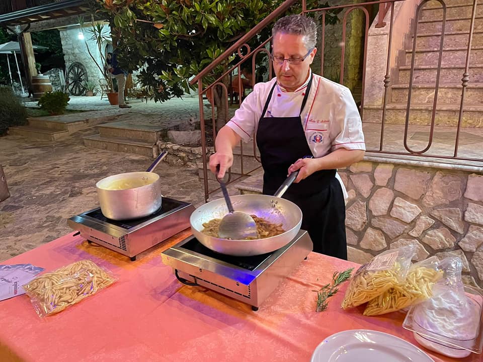 Al rientro lo chef Solimeo delizierà i convenuti con un pranzo al Pentagri a base di verdure, succulente carni locali, frittelle di erbe selvatiche e uno speciale primo piatto mantecato a vista: gli spaghetti quadrati del Brigante.