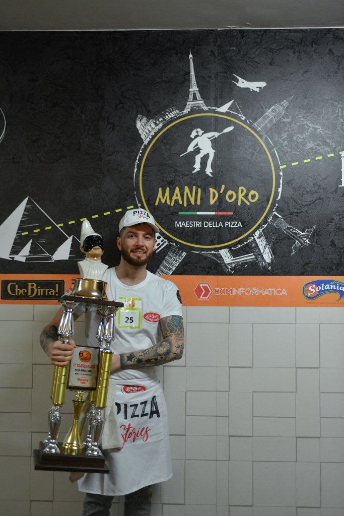 Michele De Martino ha vinto presentando una Pizza Margherita con impasto diretto con farina da 280 di W, 24 ore di lievitazione, di cui le prime 6 a temperatura ambiente, 12 ore di frigo, poi staglio e altre 6 ore a temperatura ambiente.