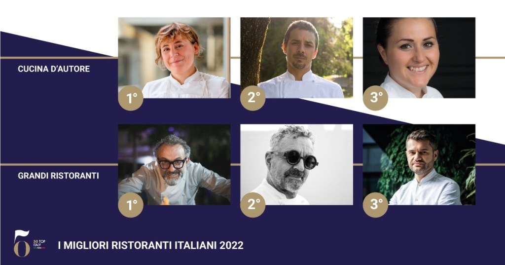 Nella prima categoria a trionfare come detto è stata l’iconica insegna dello chef Massimo Bottura, Osteria Francescana, di Modena; al secondo posto Uliassi, altro tempio della cucina italiana guidato da Mauro Uliassi in quel di Senigallia (AN); terza piazza per Enrico Bartolini MUDEC di Enrico Bartolini, a Milano; appena fuori dal podio Daní Maison, di Ischia (NA), e Duomo, di Ragusa.