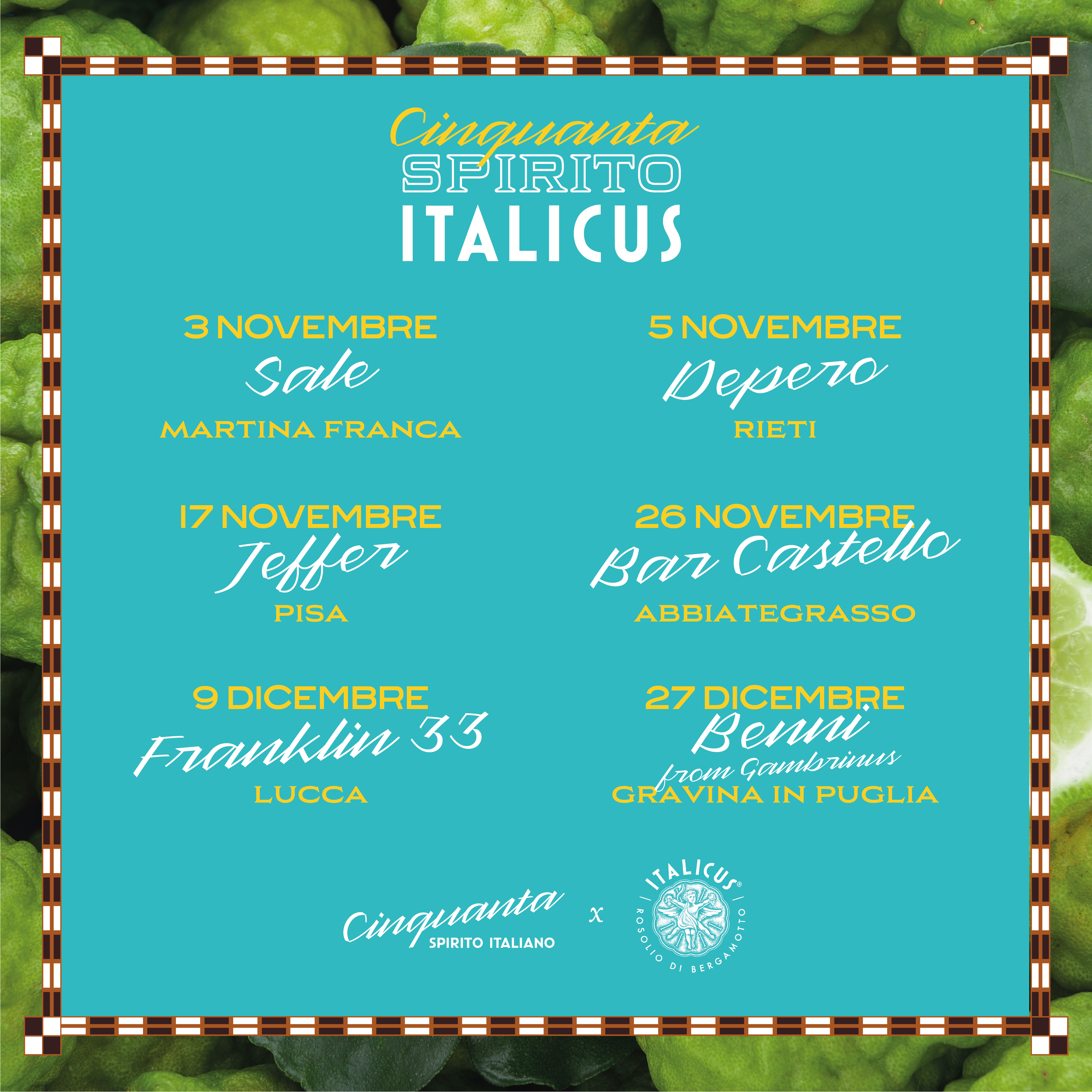 Attraverso ITALICUS, il rosolio di bergamotto dell’azienda fondata da Giuseppe Gallo, l’idea di Alfonso e Natale, le due anime del cocktail bar paganese “Cinquanta – Spirito Italiano”, é quella di svelare alla nazione la bellezza e unicità di altre esperienze simili a quella loro, andando ad incontrare altri “bar di provincia”, immersi in zone meno conosciute della Penisola, che riescono a portare avanti progetti di alta qualità simile a quelli delle città metropolitane.