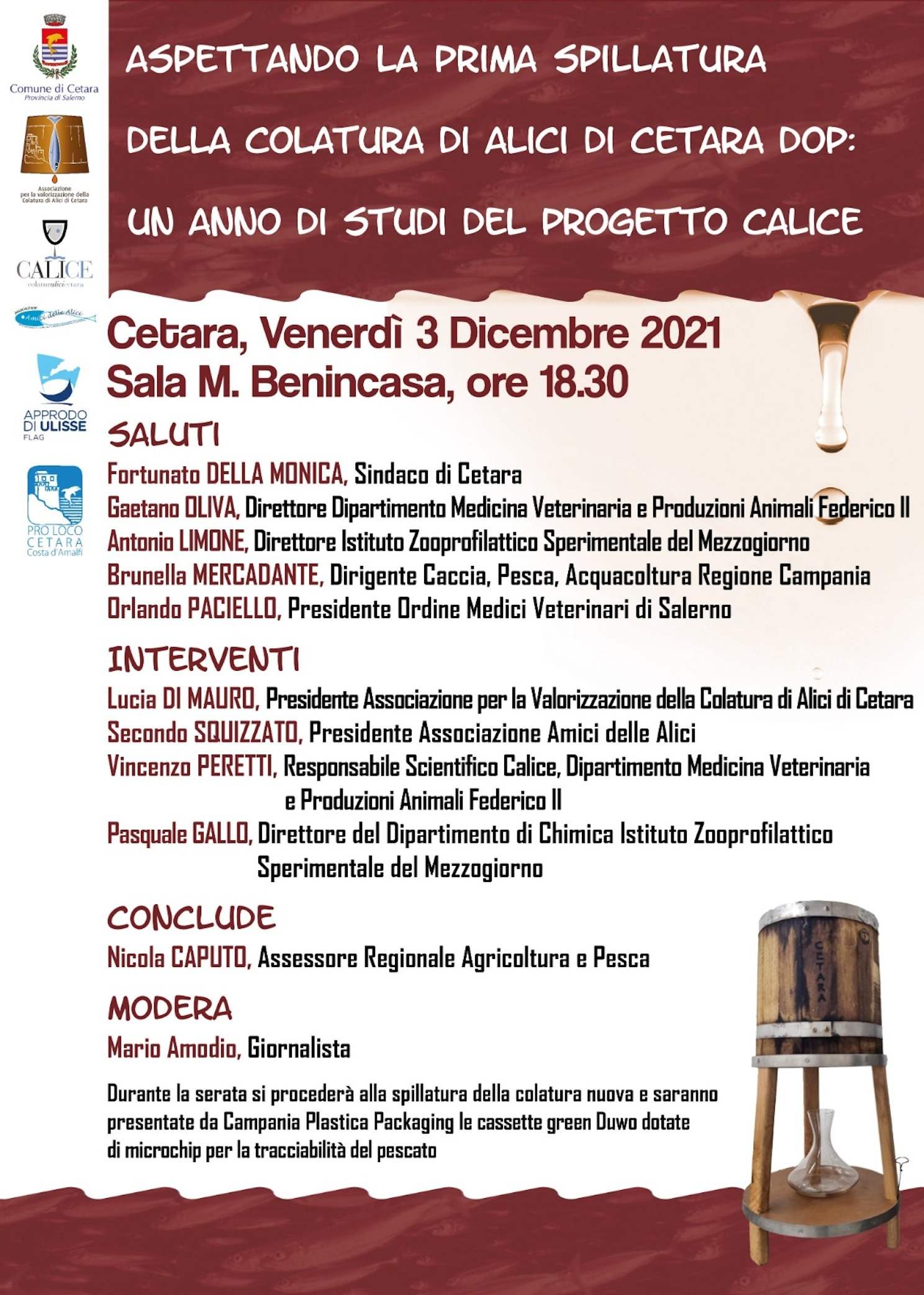 Venerdì 3 dicembre a Cetara, presso la sala Sala M. Benincasa, alle ore 18.30, si terrà il convegno “Aspettando la prima spillatura della Colatura di alici di Cetara dop: un anno di studi del Progetto Calice”