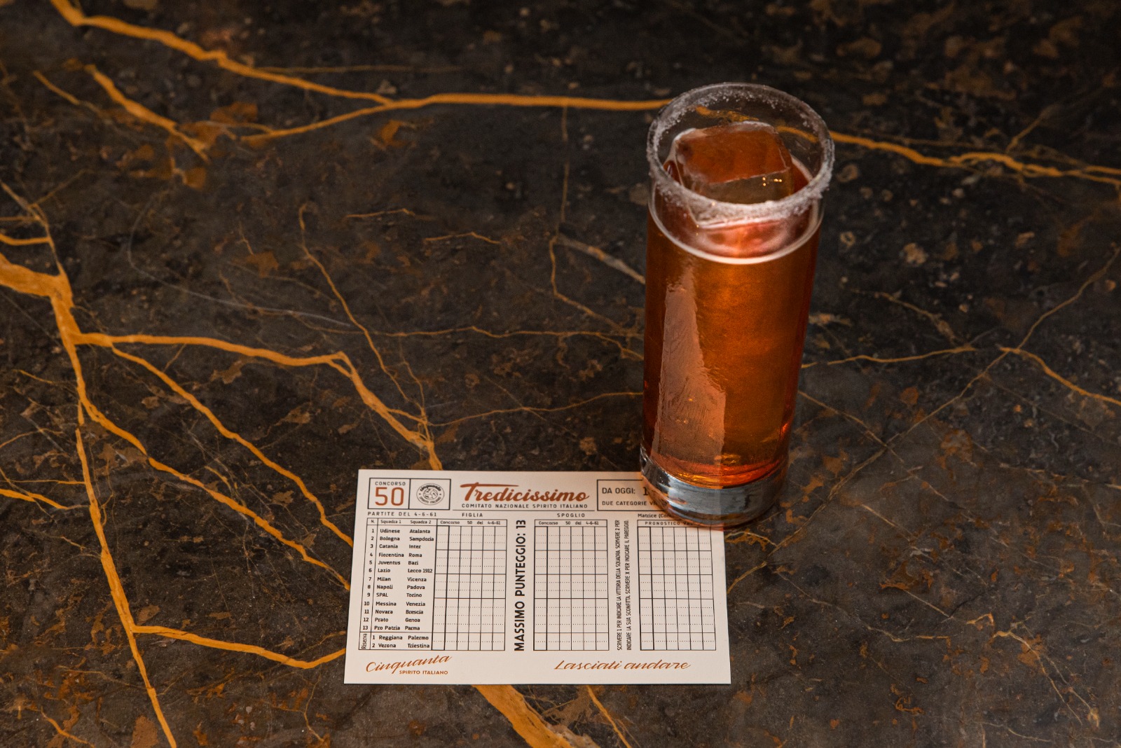 Il 21 gennaio del 1951, il “tredici” al Totocalcio faceva il suo esordio nella vita degli italiani. Il cocktail bar “Cinquanta – Spirito Italiano” di Pagani (Sa), nel 71esimo anniversario di questo evento che per decenni ha contraddistinto i weekend sportivi dell’Italia, celebra l’evento con un cocktail interamente dedicato al “tredici alla schedina”, ovvero il “Tredicissimo”.