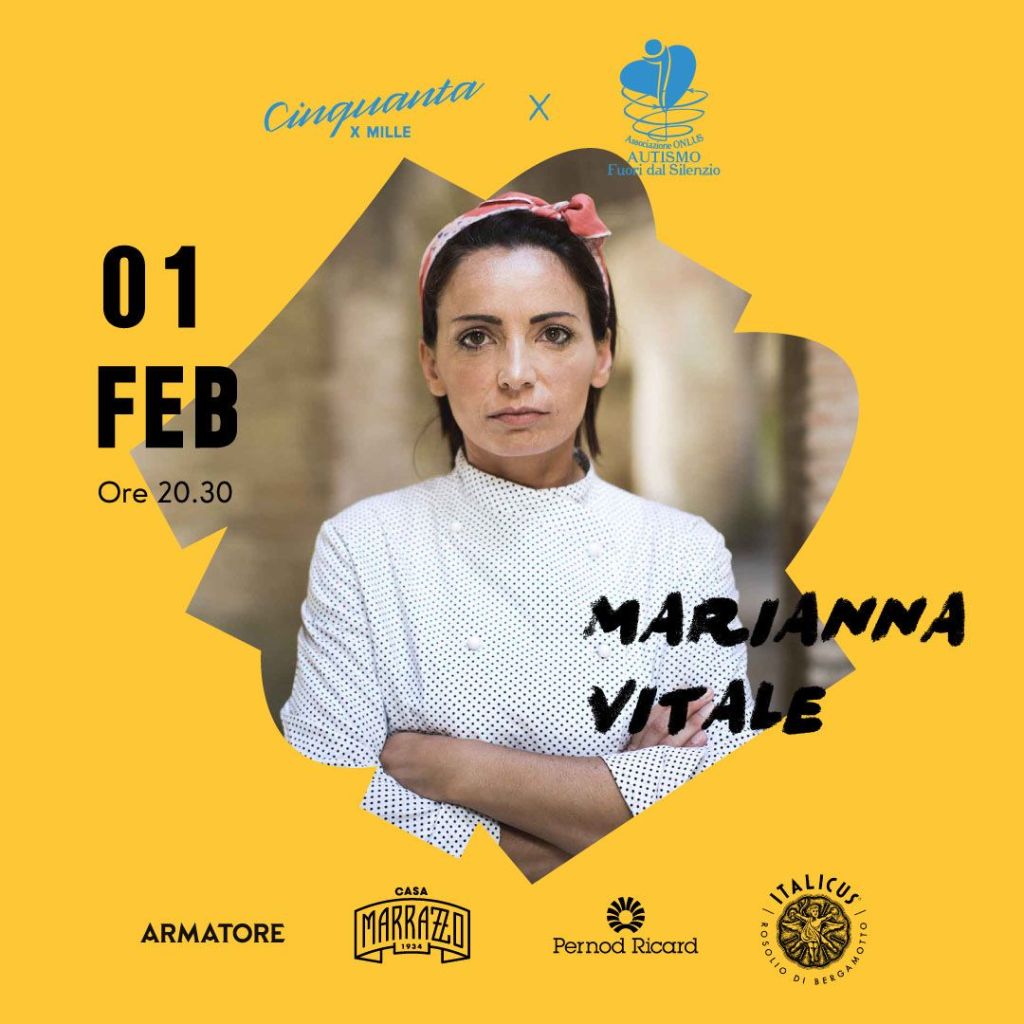Dopo la prima serata con lo chef napoletano Francesco Sodano, ai fornelli sarà il turno della chef stellata Marianna Vitale, capitana del “Sud Ristorante” di Quarto Flegreo, in provincia di Napoli. Il ricavato della cena di martedì 1 febbraio sarà devoluto all’associazione “Autismo fuori dal Silenzio” di Pagani (Sa), Onlus che sostiene i genitori di bambini autistici occupandosi di attività scolastiche ed extrascolastiche, attività di supporto e sollievo alla genitorialità con corsi di parent training, servizi di supporto e sollievo alle famiglie, attività di educazione al corpo e al movimento psicomotorio e Analisi del Comportamento Applicata.