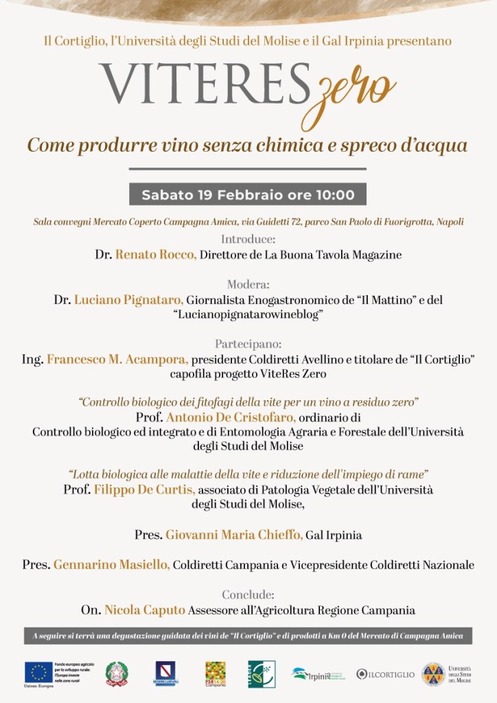 Sabato 19 febbraio alle ore 10.00 si terrà, presso la sala convegni Mercato Coperto Campagna Amica, via Guidetti 72, parco San Paolo di Fuorigrotta, Napoli della Coldiretti Campania, la presentazione di “Vitereszero: come produrre vino senza chimica e spreco d’acqua”, il progetto nato dal partenariato de Il Cortiglio, azienda vitivinicola e olivicola irpina, l’Università degli Studi del Molise e Gal Irpinia.