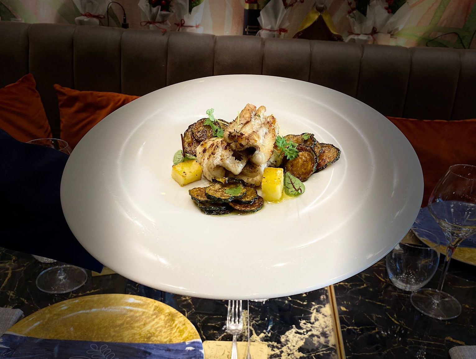 Pesce tipico delle festività, il capitone qui viene proposto alla brace, anziché fritto, e al suo fianco troviamo delle zucchine fritte e conservate in una marinata all’aceto e servito nel piatto con cubi di patata.