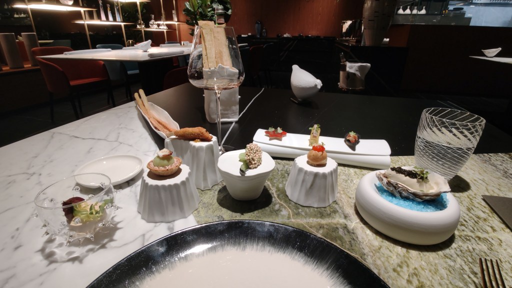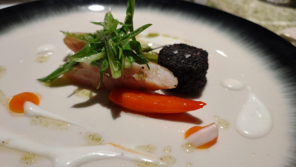 olio al finocchietto, pralina croccante al nero di seppia ripiena di guancia di ricciola, maionese di yogurt di
