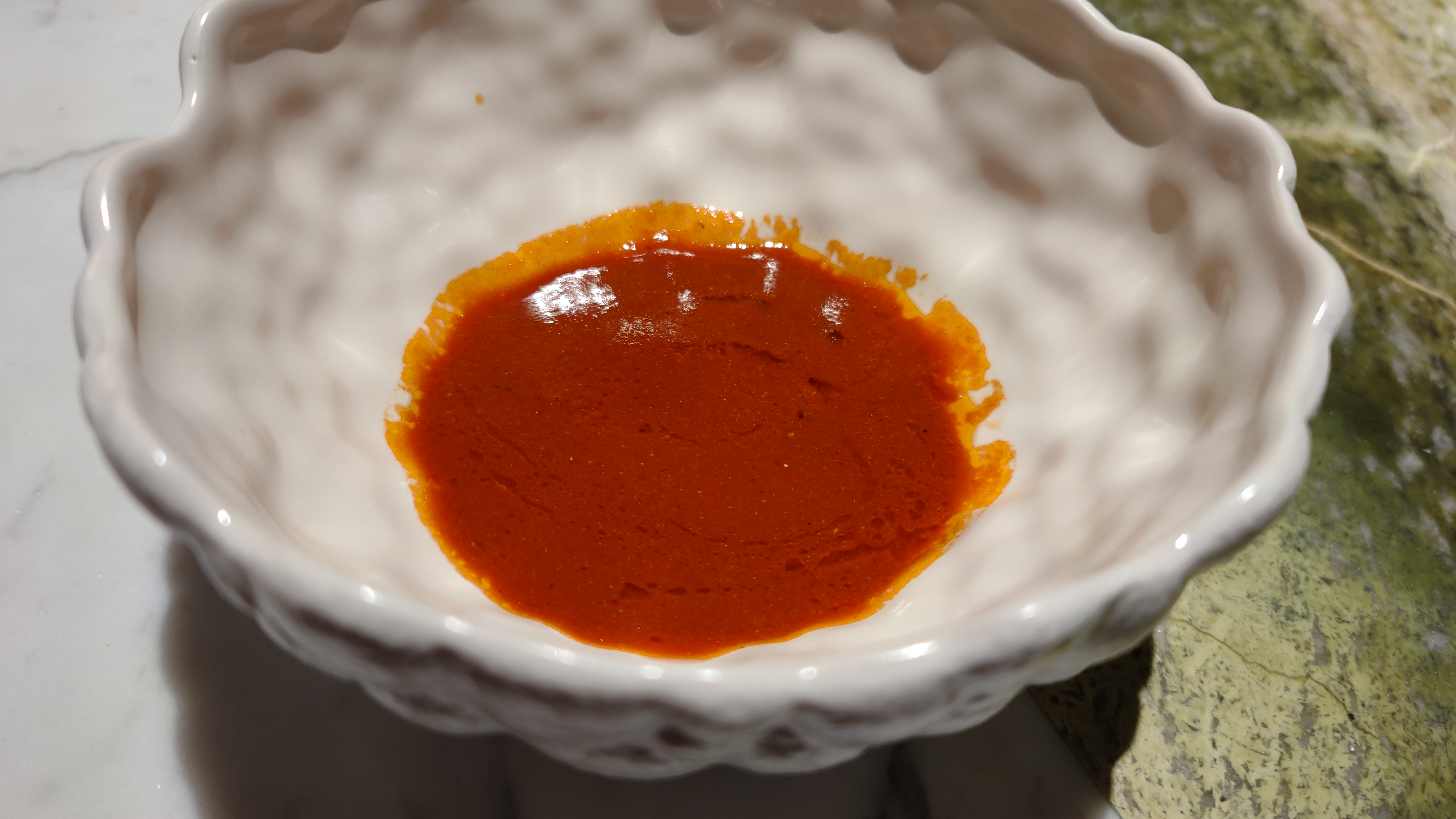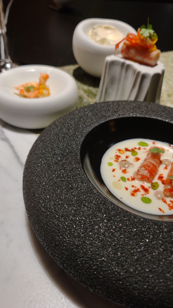 gambero di Policastro scottato su crema di mozzarella di bufala e maionese di gamberi, tartare di gamberi