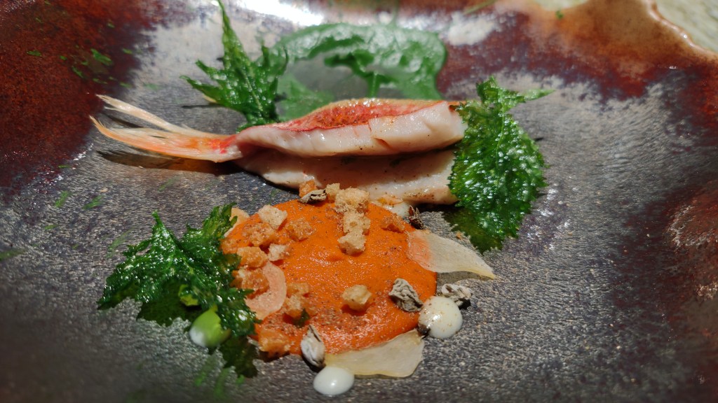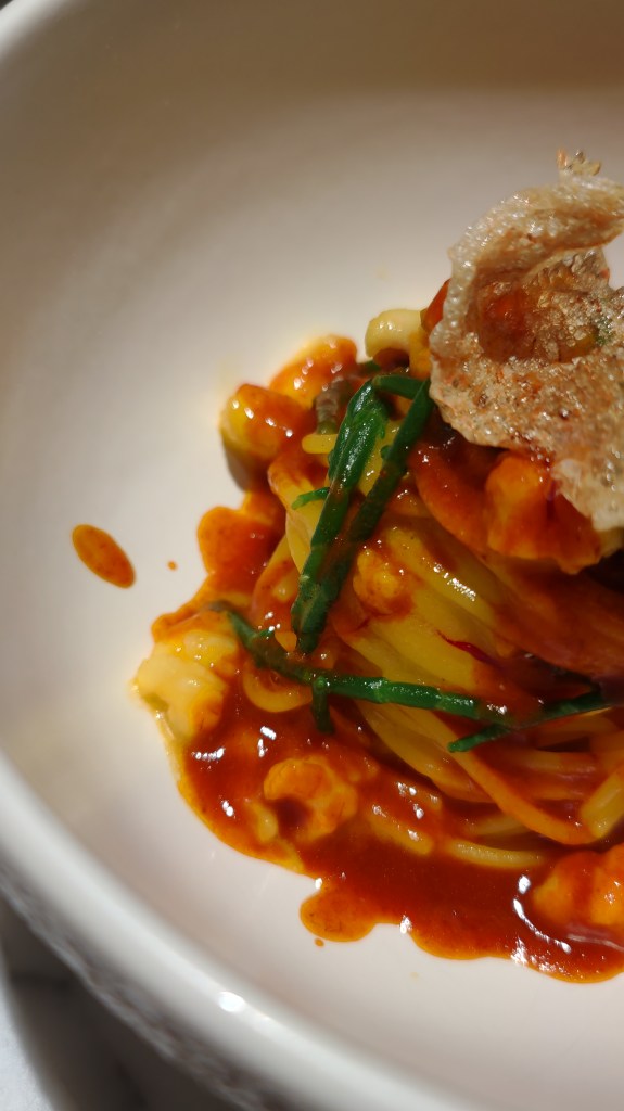 e il suo ristretto, asparagi di mare e pelle croccante di scorfano