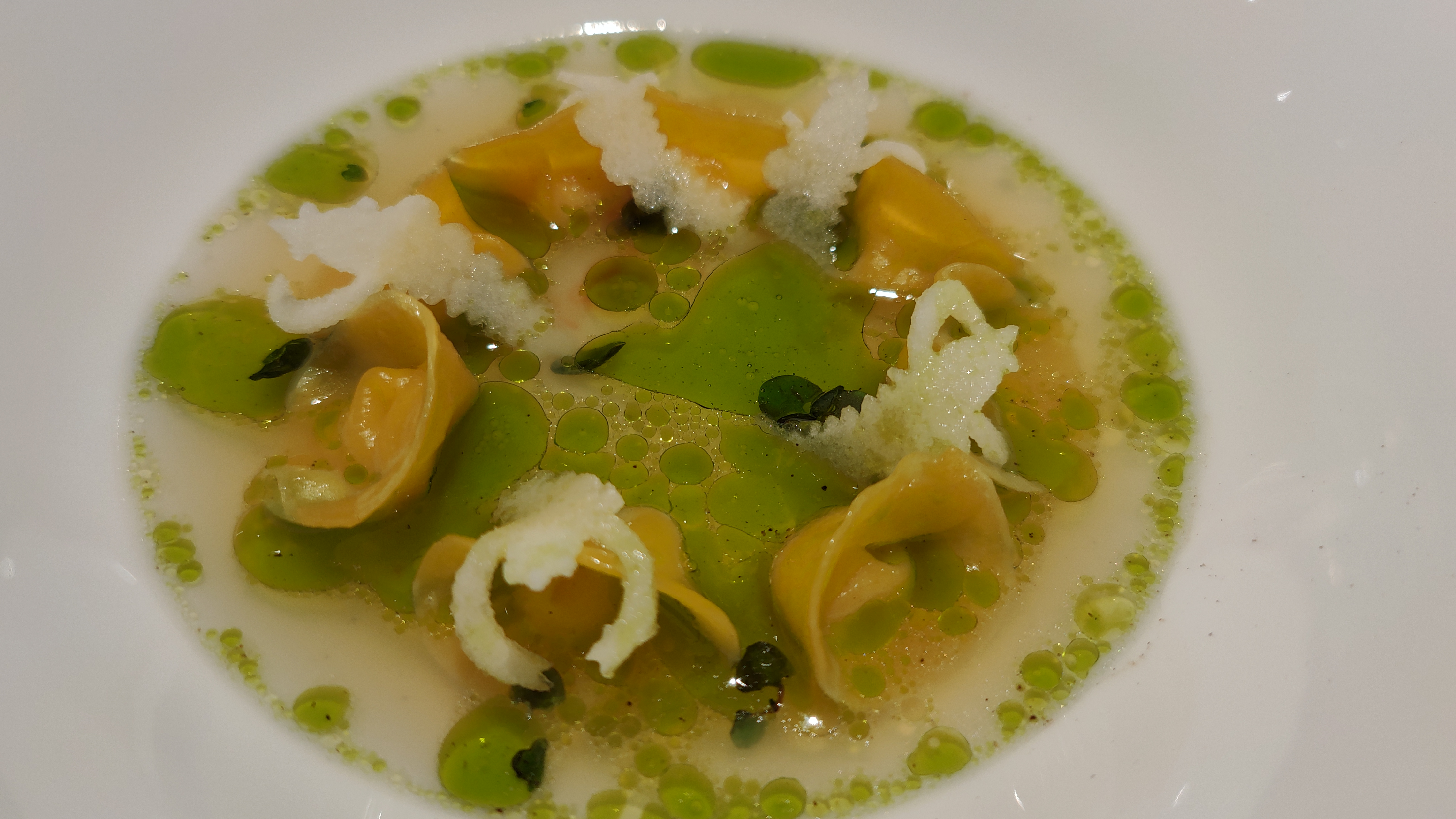 tortelli ripieni di scampi e limone adagiati su battuto di scampi e mela croccante, serviti con brodo caldo di