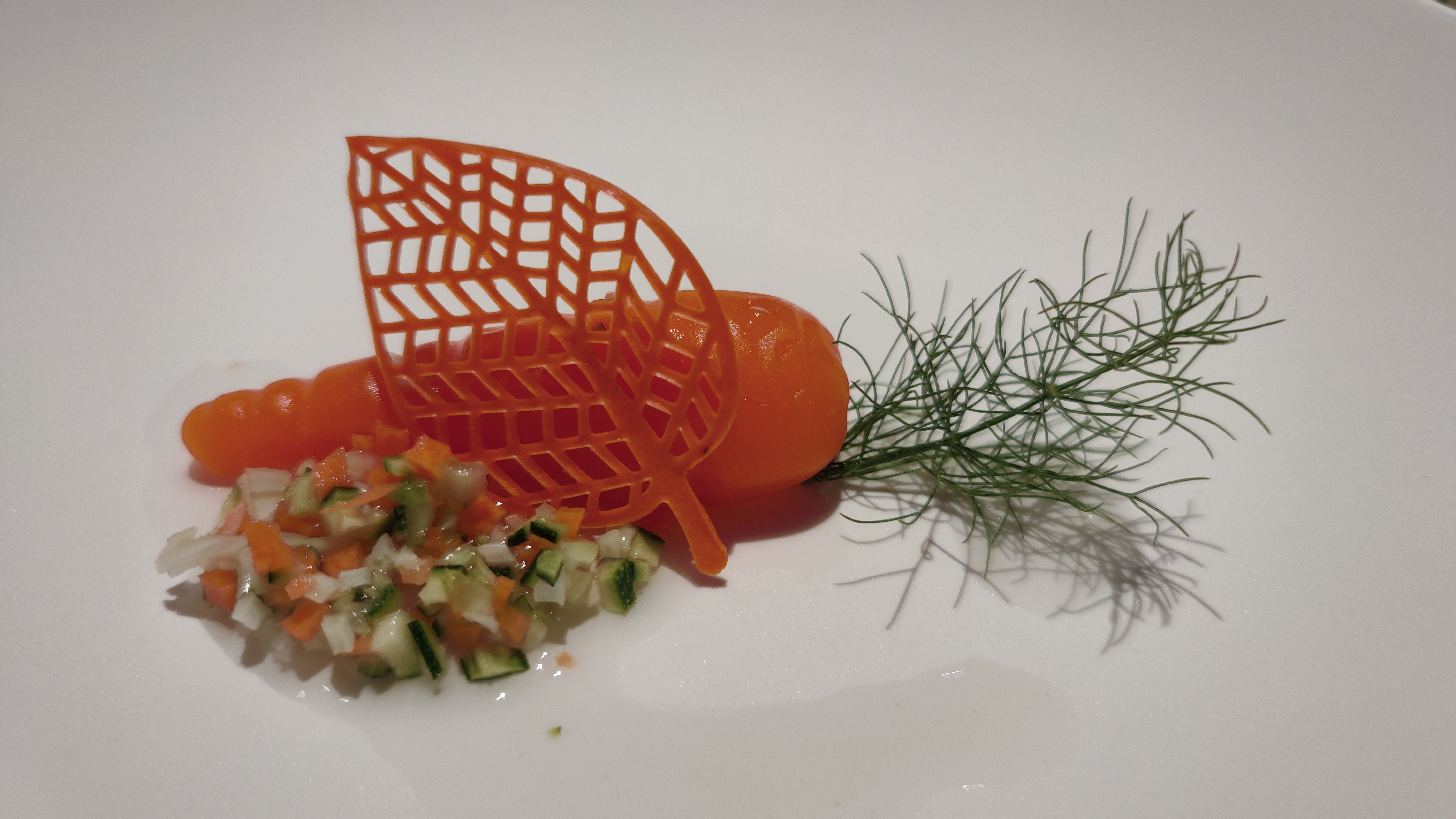 Ricciola cotta in padella con purea di carote e carotina baby glassata, insalatina di puntarelle condita con