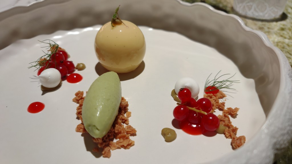 sfera di cioccolato bianco, mandorle con cuore di lampone, crumble croccante e gelato al basilico