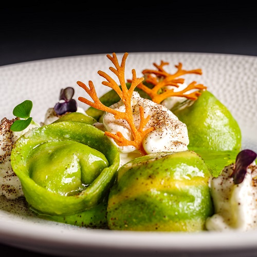 – “Tortello Bicolor ripieno alle patate di Colfiorito e guanciale di Norcia, crema di broccolo calabrese, spuma al pecorino di Montecristo, cenere di cipolla Cannarese”