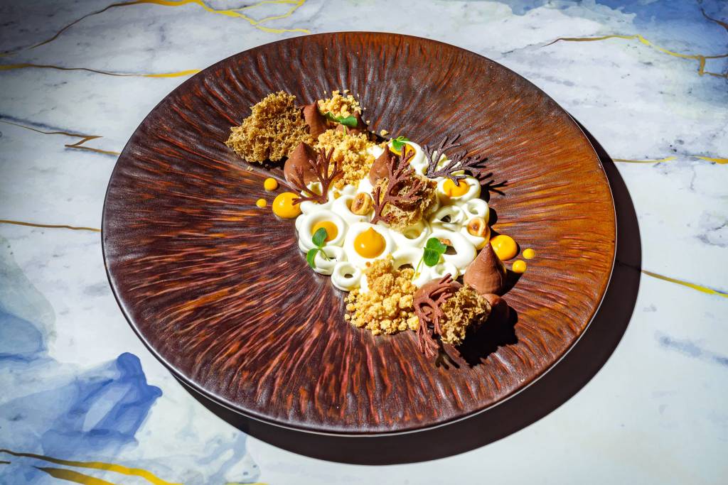 -“Zucca, Gianduja & Caffè: cremoso al cioccolato e nocciole, spuma al caffè, crema di zucca violina, riso cotto alla vaniglia, crumble al pepe di Sechuan”
