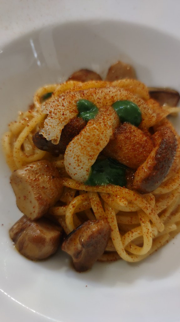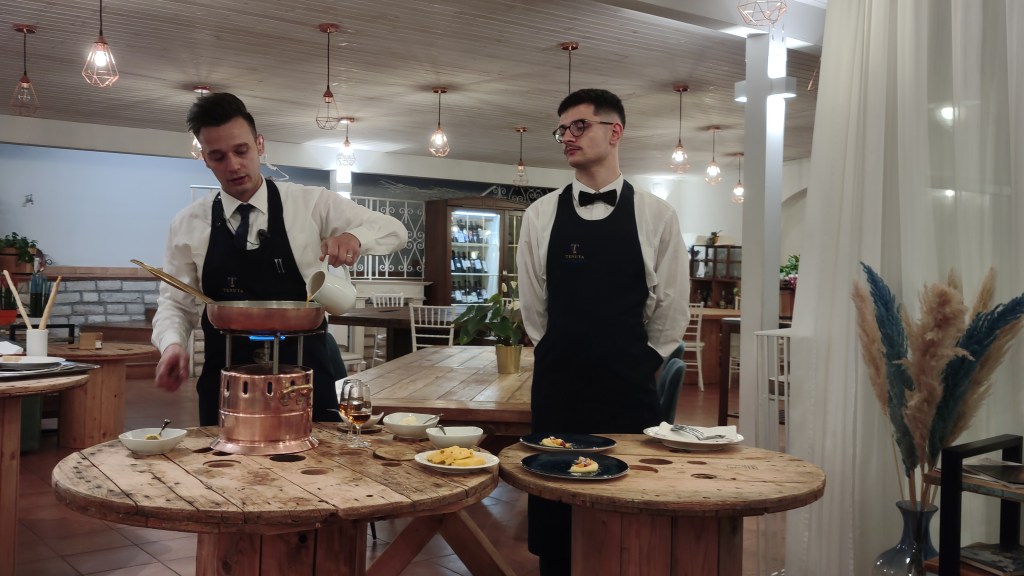 La cucina dello chef Afeltra è caratterizzata dall’utilizzo di ingredienti pregiati, dalla presentazione curata e dall’attenzione ai dettagli. È una cucina che punta alla creazione di piatti raffinati e sofisticati, in grado di soddisfare i palati più esigenti. I piatti sono ben presentati con un’attenzione particolare al colore, alla forma e alla disposizione degli elementi. Inoltre lo chef sta cercando di ridurre l’impatto ambientale della produzione di cibo, scegliendo ingredienti locali, stagionali e utilizzando tecniche di produzione sostenibili. Nel menù infatti ci sono molti ingredienti a Km0 provenienti dai terreni dei Cannavacciuolo, in primis l’olio extravergine d’oliva, e dai produttori locali. Il paniere è ricchissimo non mancano carni, latticini, pescato, frutta e verdura. I piatti sono essenzialmente mediterranei, forte è il gioco di consistenze tra gli elementi utilizzati, di contrasti e di bilanciamenti. C’è qualche piccola influenza extra-nazionale ravvisabile nella preparazione di alcune salsa di accompagnamento ma si bada all’essenzialità, al minimalismo ed ad esaltare al massimo la materia prima utilizzata. Tra i piatti in carta da assaggiare sicuramente il carciofo marinato con mousse di bufala e terra di tarallo, un ricordo d’infanzia dello chef che da bambino mangiava il carciofo arrostito accompagnandolo con tarallo mandorle, sugna pepe e fette di mozzarella e le linguine di Gragnano trafilate al bronzo con crudo di scampi, porcini e salsa di basilico, un riuscitissimo connubio tra mare e terra. La carta dei vini è identitaria della cantina della Tenuta, con buona predominanza campana ma le bottiglie esprimono carattere e personalità tutte da scoprire attraverso le pregiate DOC, DOCG, IGT nazionali. E’ possibile anche degustare un percorso curato dallo chef del valore di 40 euro a persona, vini esclusi. Interessantissima la carta delle “acque di lusso”, questo tra l’altro è l’unico locale in zona ad averla, in cui si spazia dalla Romania alle Isole Fiji, passando per Italia, Spagna, Francia, Repubblica Ceca Regno Uniti, Polonia e Norvegia.