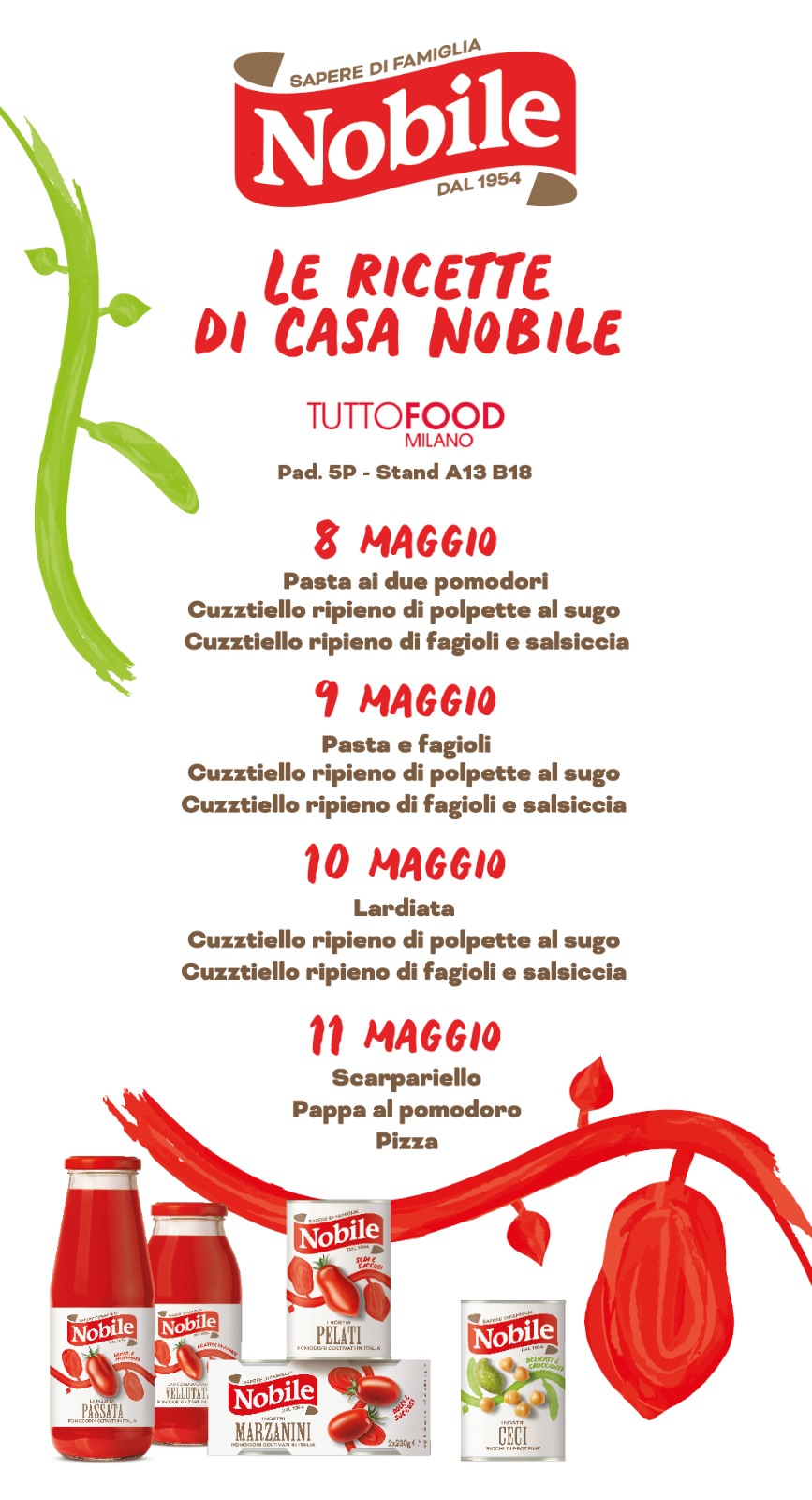 Nobile Pomodori in scena a “Tutto Food” col nuovo packaging e tutte le novità di prodottoChi vorrà saperne di più e degustare i prodotti Nobile, può recarsi presso il Padiglione 5P Stand A13 B18. Nello stand si darà grande risalto alla cucina, così che i visitatori possano osservare gli chef di Casa Nobile mentre preparano le ricette della famiglia Di Leo vivendo un’esperienza conviviale e coinvolgente. Sarà inoltre l’occasione per scoprire e degustare tutte le novità di prodotto 2023/2024.