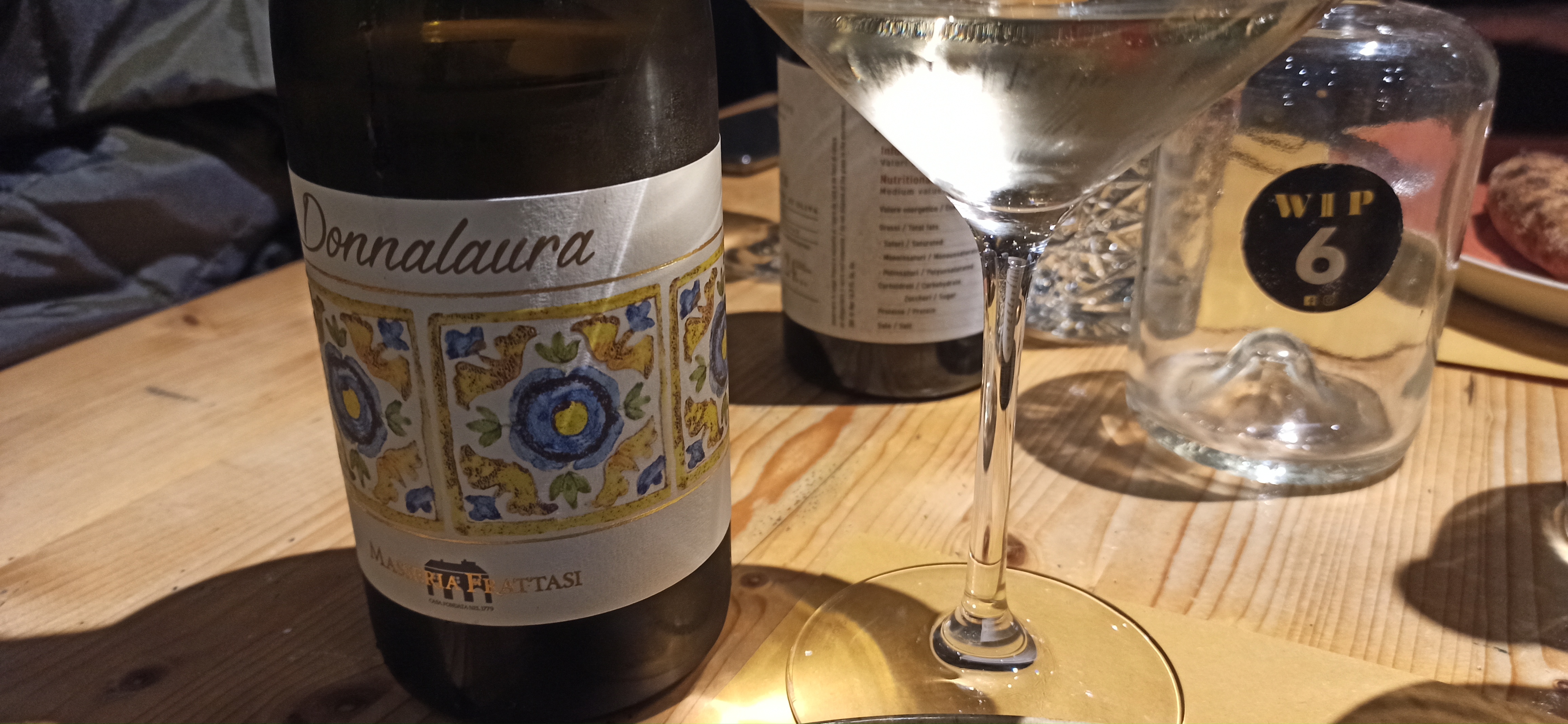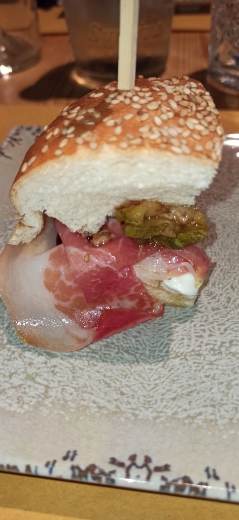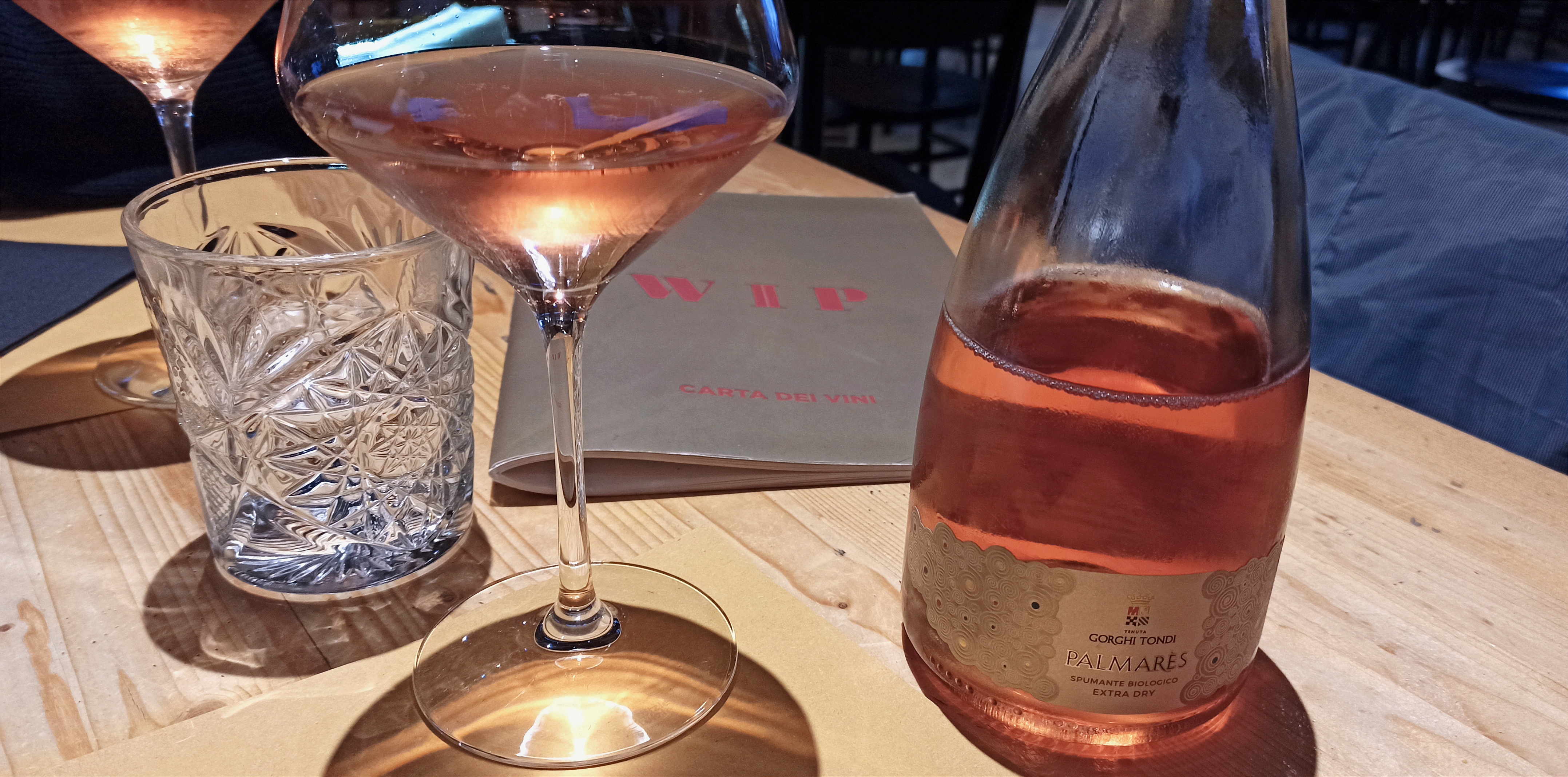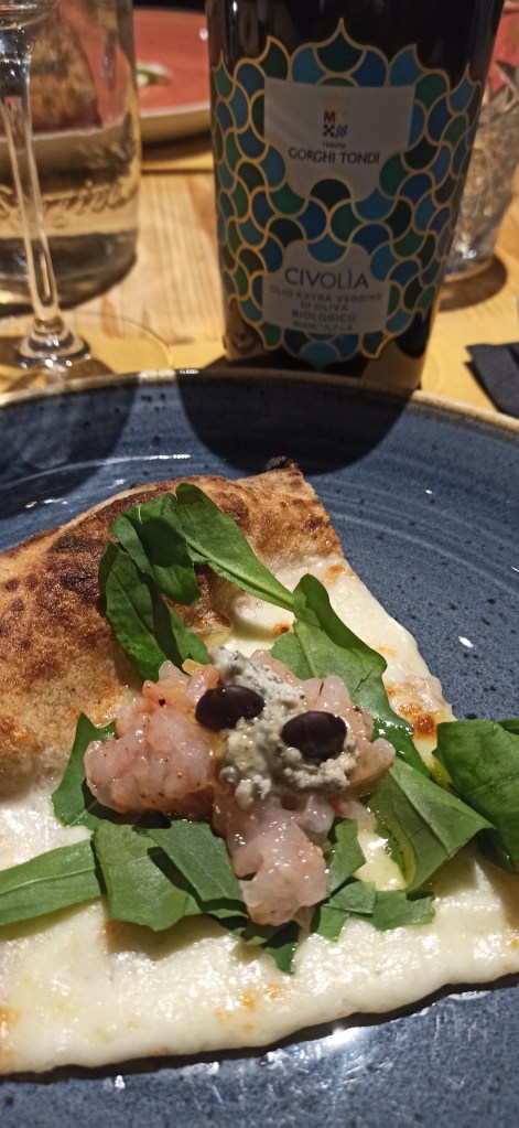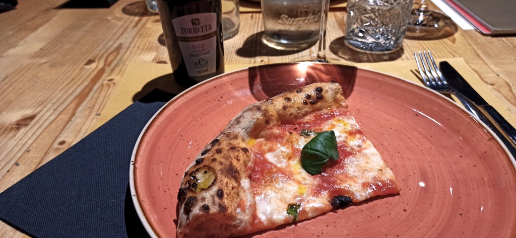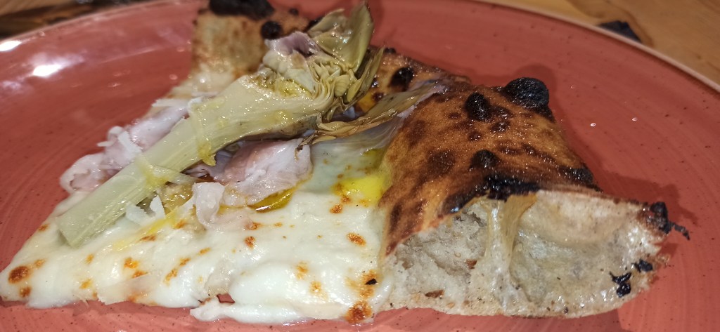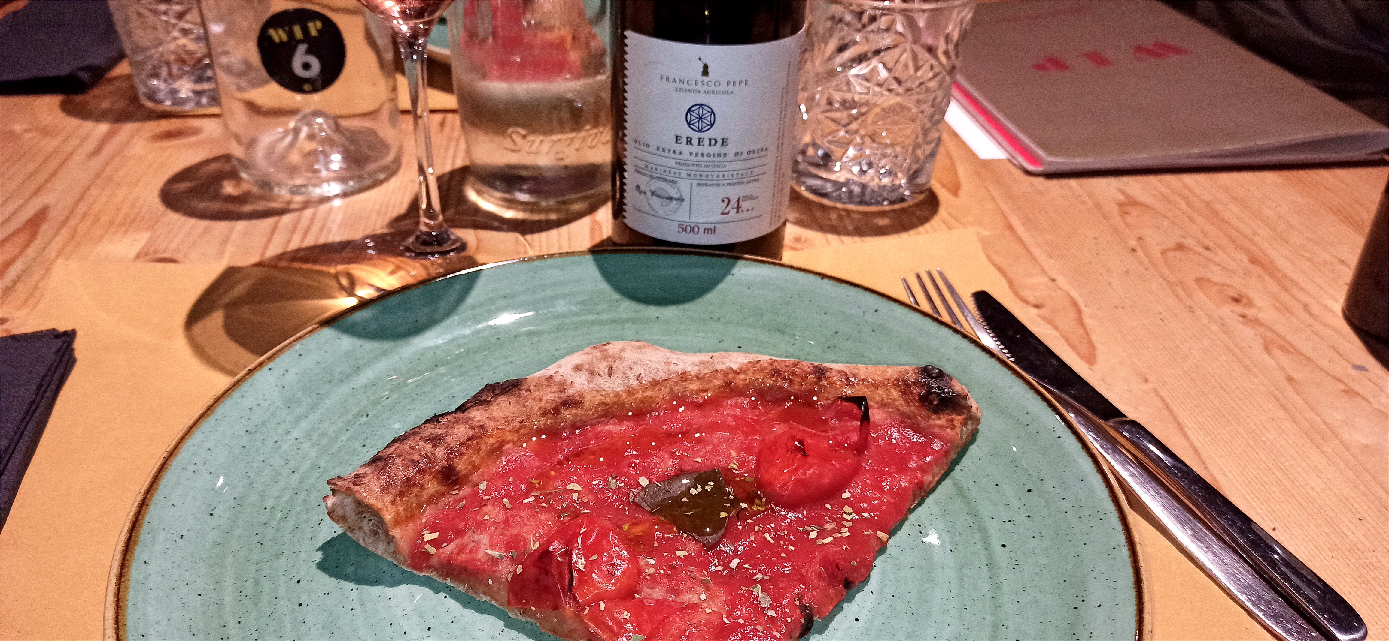 La cena è partita subito fortissima con una piacevole bollicina rosata sicula per accompagnare lo spicchio di panino con crudo pesante friulano, stracciata di bufala campana, zucchine San Pasquale sott’olio, noci e aceto balsamico. Il panino ha ricreato immediatamente sensazioni di comfort zone domestiche, le zucchine infatti sono esattamente quelle delle mamme o nonne che vengono messe nei vasetti durante la bella stagione per poi essere utilizzate in inverno come souvenir estivo. Lo spumante dal colore buccia di cipolla carico, al naso fresco e delicato, con note di piccoli frutti rossi e fragoline appena raccolte, al palato intrigante, vivace e ben equilibrato, con una piacevole vena acida, ha ripulito la bocca dall’untuosità del goloso prosciutto e della burrata per predisporla piacevolmente alla tetralogia di pizze di lì a poco in arrivo.