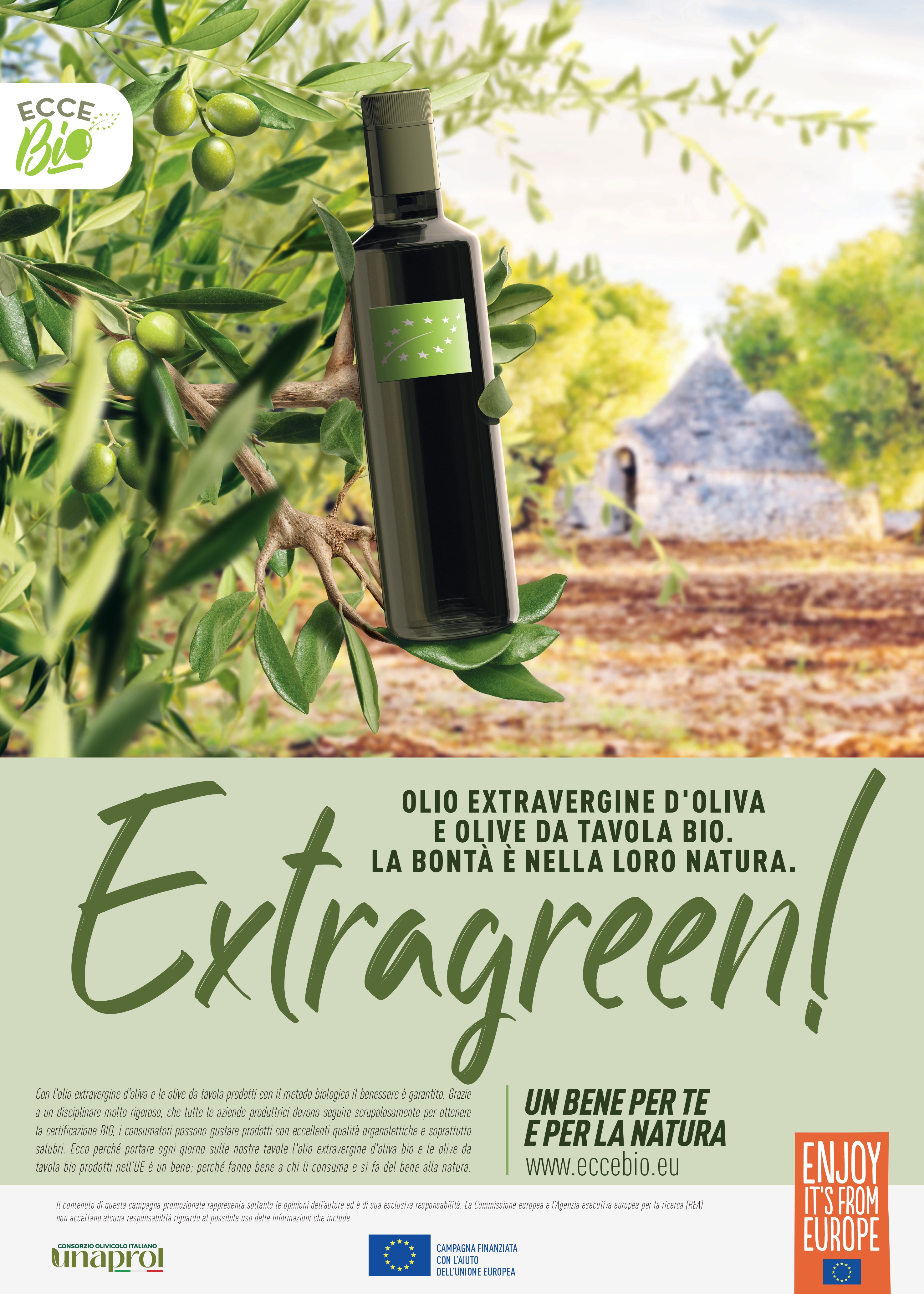 Un’operazione formativo-culturale in cui oltre al regime di qualità biologico si vogliono spiegare le caratteristiche fisiche dell’olio extravergine di oliva e delle olive da tavola bio in termini di biodiversità, di gusto, di proprietà organolettica, passando attraverso un percorso in cui sono fortemente presenti sia le politiche europee sulla sostenibilità (Green Deal e Farm to Fork) sia le tradizioni e la storia delle popolazioni mediterranee.