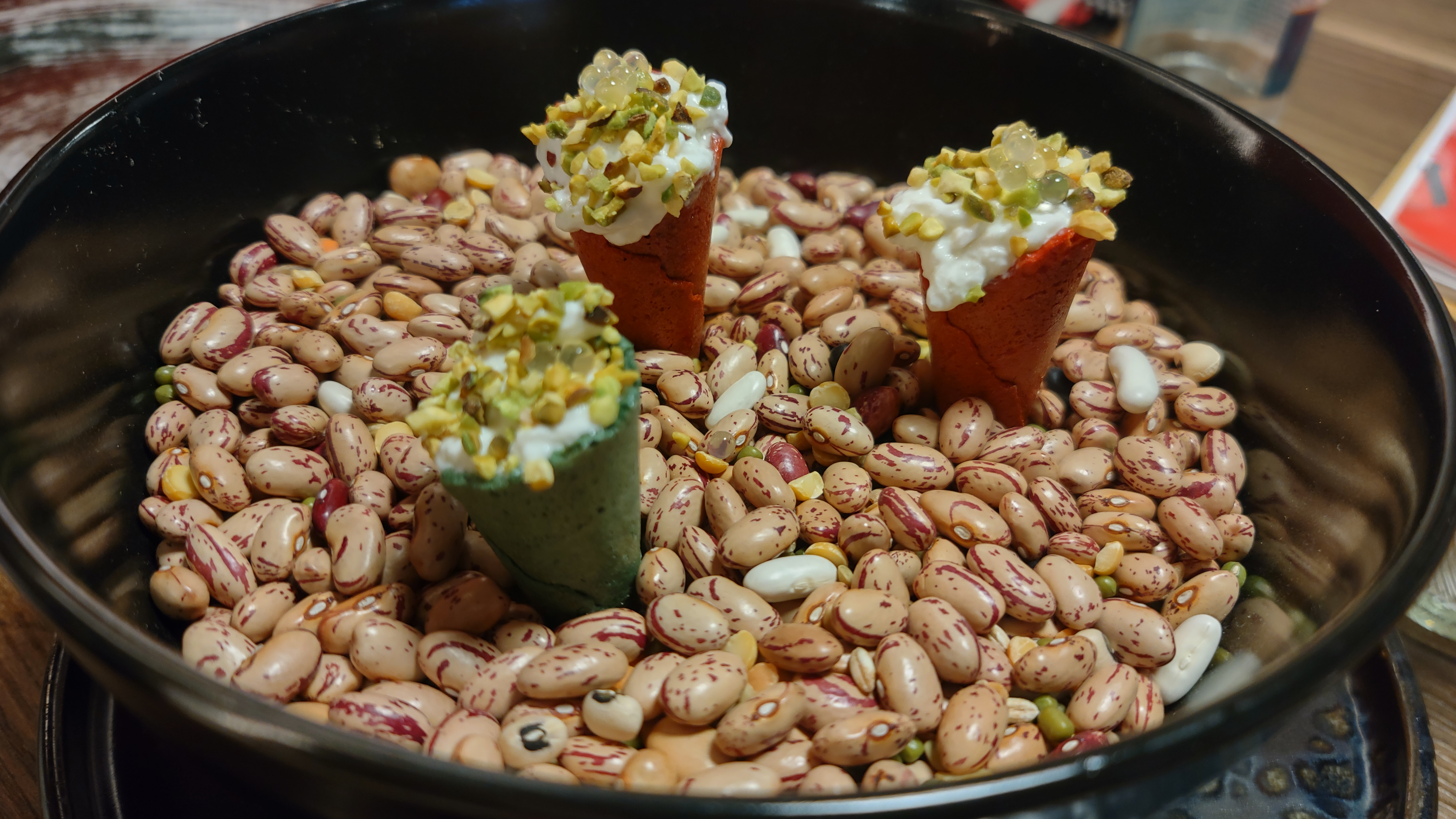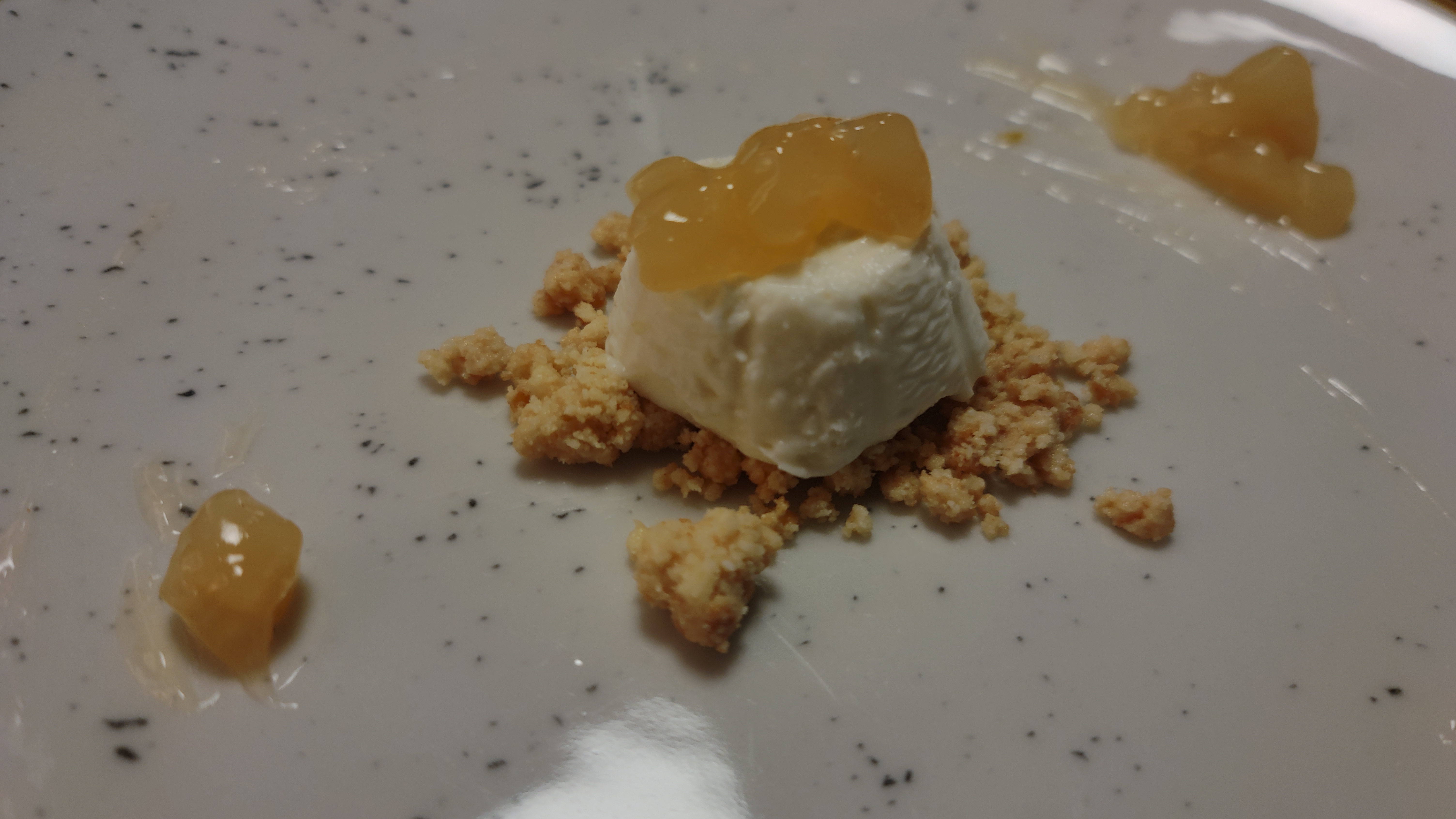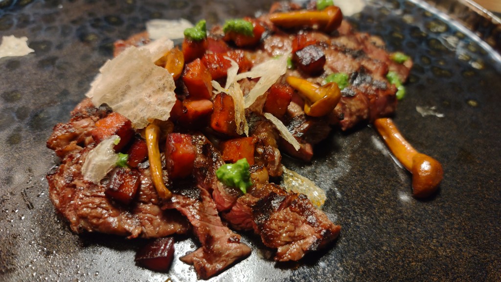 Volendo poi puntare sulle carni, allora non si può andare via da Flame senza aver divorato la tagliata selezione Mazury (scottona Prussiana che arriva dalla Polonia settentrionale – ex Prussia – precisamente dalla regione del Mazury. Particolare razza di provenienza tedesca che vive allo stato brado, molto marezzata), affumicata con i legnetti di faggio, con funghi cardoncelli trifolati, cubetti di chorizo alla plancia, pesto di prezzemolo, perle di jamon e chips di riso, un’esperienza carnivora che coinvolge i sensi e placa i bollori delle fiamme ardenti spente dall’Aglianico di Paestum Cantina De Concilis.
