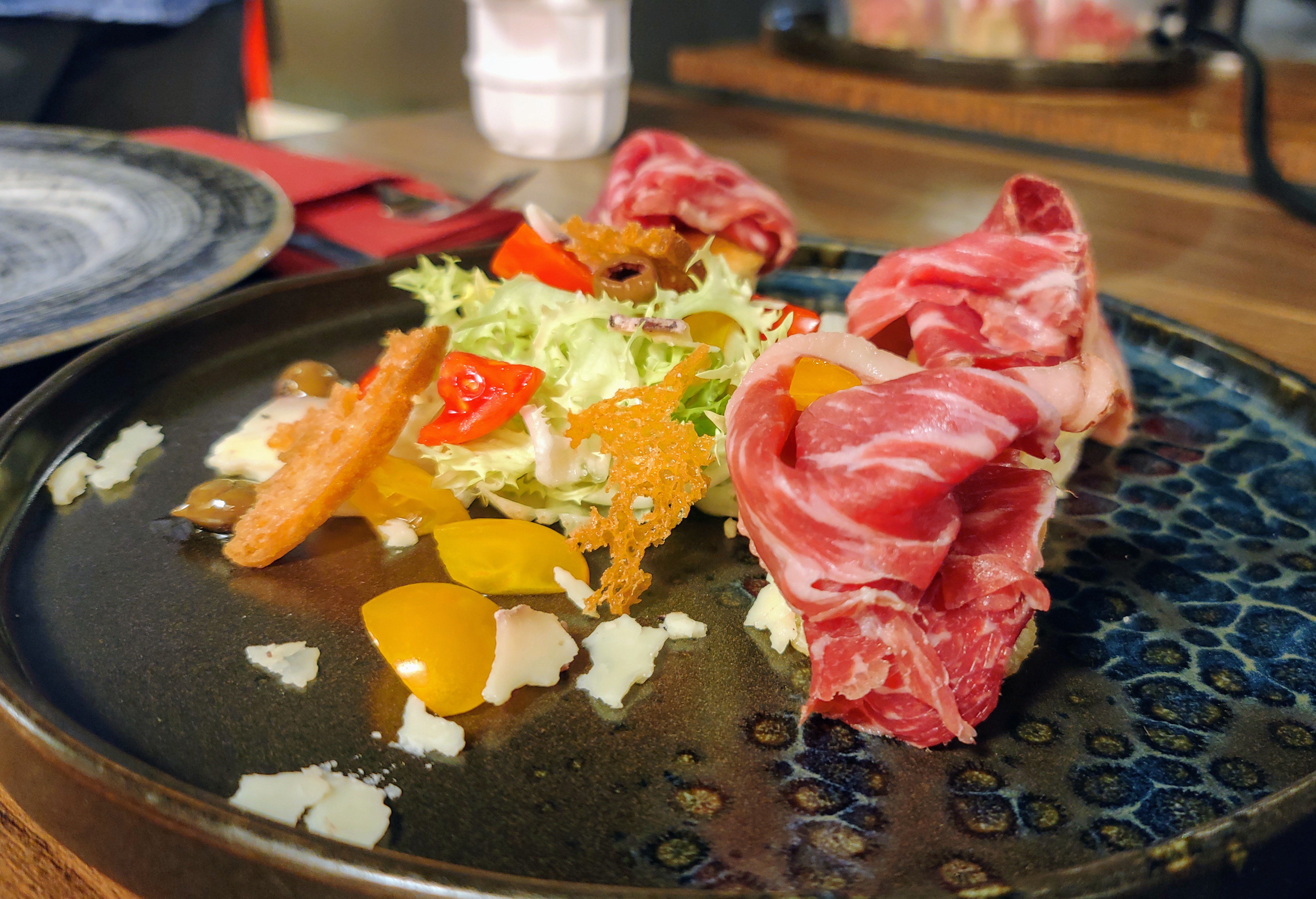 Le premesse ci sono tutte, la location è accogliente, il personale gentile e preparato, la gastronomia affonda le radici nella cucina campana, strizzando l’occhio alla contemporaneità e alle innovazioni . La pizza in pala ad esempio presenta un impasto molto alveolato con elevata idratazione, frutto del mix di farine di riso, soia e zero che donano la tipica croccantezza a questa tipologia di prodotto proveniente dal territorio laziale (pinsa). Si differenzia dalla pizza classica per la sua forma rettangolare o ovale e per la sua preparazione e cottura. La pizza in pala viene preparata utilizzando una base di pasta simile a quella della pizza tradizionale, ma solitamente più morbida e leggermente più spessa. Viene stesa su una pala di legno o metallo, da cui prende il nome, e condita con gli ingredienti tipici della pizza, come pomodoro, mozzarella, salumi, formaggio e verdure. La cottura avviene in forni a legna o a gas, dove la pala con la pizza viene inserita direttamente sul fondo del forno ad una temperatura di 300 gradi circa. Interessanti la “Ciummarella” con peperoncini verdi saltati con pomodorini, provola di Agerola, salsiccia e caciocavallo invecchiato in grotta e la “Bufala e Nduja” con mozzarella di bufala, salsiccia di nero casertano, nduja di Spilinga e nocciole tostate.