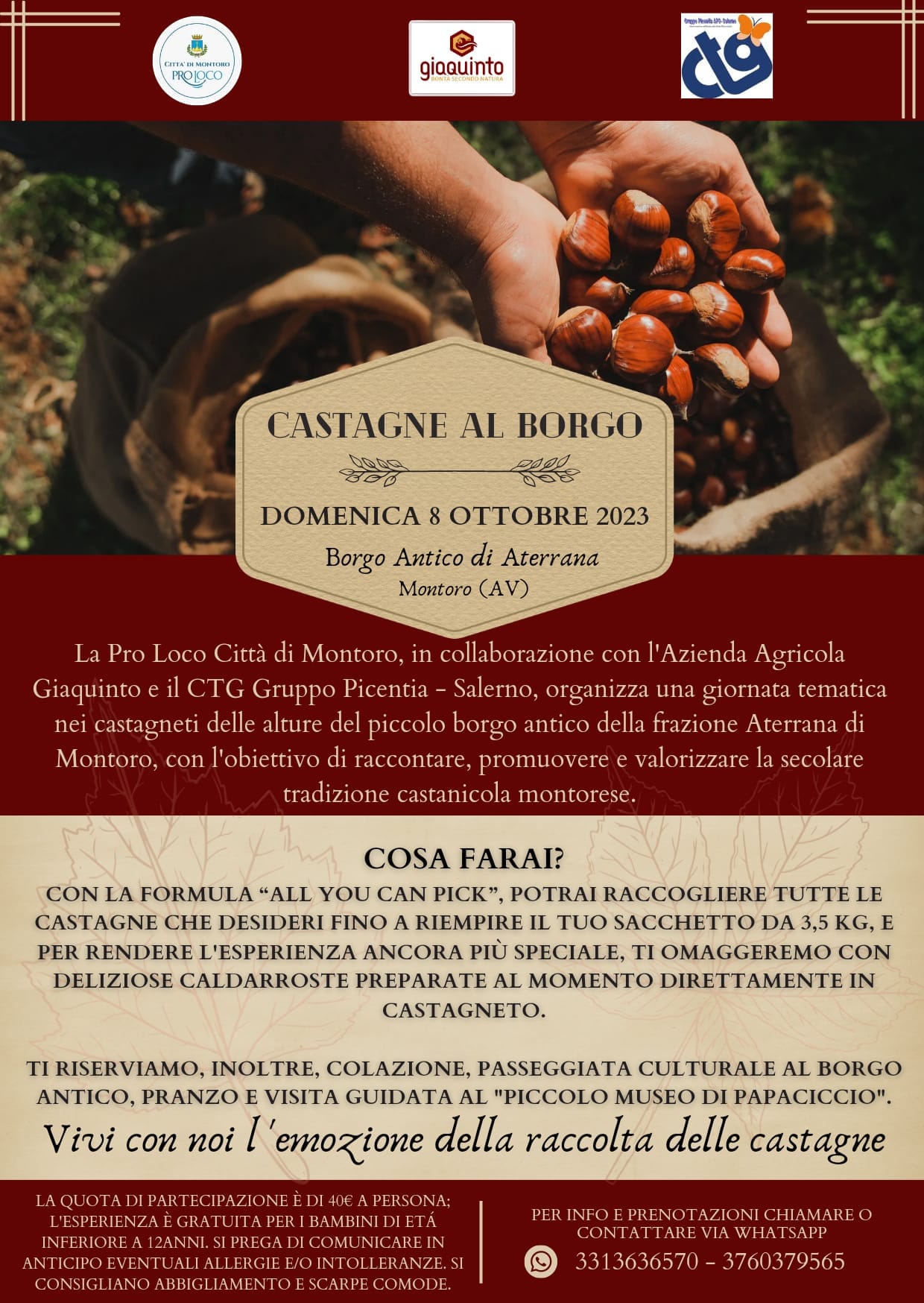 Domenica 8 ottobre presso l’antico Borgo di Aterrana-Montoro (AV) la Pro Loco Città di Montoro, il Gruppo CTG Picentia di Salerno e l’Azienda Agricola Giacquinto, hanno unite le proprie forze in un contributo, uno scambio di idee e pareri che hanno portato all’organizzazione dell’iniziativa “Castagne al Borgo”, per la valorizzazione della secolare tradizione castanicola montorese. Alle 9:00 si partirà dal Borgo di Aterrana dove si potranno degustare tutte racchiuse in una speciale colazione, i prodotti tipici dell’azienda agricola assieme a pane tostato. Con un esperto agronomo si proseguirà alla volta dei castagneti ubicati in loco per conoscerne le caratteristiche e raccogliere le pregiate castagne, sostando di tanto in tanto lungo il percorso in cui sono previsti assaggi di altre specialità e delle ghiotte caldarroste. Ogni partecipante potrà portare a casa una sacchetta del peso di 3.5 Kg. All’ora di pranzo nell’aia aziendale sarà presentato grazie alla maestria dei cuochi locali un menù in cui ad essere protagonista sarà la castagna assieme a tutti i prodotti autunnali territoriali. Dopo pranzo si proseguirà verso Aterrana per approfondirne la conoscenza storica e culturale, con breve sosta al Museo della Storia Contadina Papaciccio. Per info e prenotazioni: 3313636570 / 3760379565