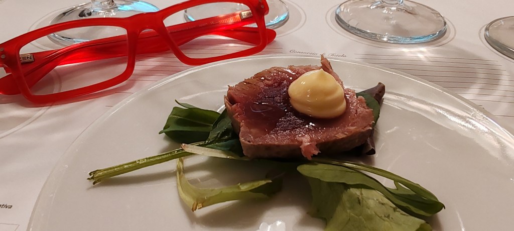 La brigata dello chef resident Vincenzo Tafuri del Ristorante Falalella ha presentato per l’occasione quattro assaggi abbinati ai rispettivi prosecchi: crostino burro di Normandia e alici sotto sale di Cetara con il Perlage Extra brut Cuvèe del Fondatore Tiziano Nardi, la pasta e patate con colatura di Cetara DOP al Sorelle Bronca Brut Particella 181 Rive di Rua 2022, il trancio di tonno scottato con la sua mayo e misticanza al Masottina Extra Dry R.D.O Levante Rive di Ogliano 2022, rivisitazione della torta fregolotta alle mandorle con Bortolomiol Cartizze Dry. Durante gli assaggi i i primi tre vini hanno presentato caratteristiche tali da poterli interscambiare anche con gli altri piatti, tranne che con il dessert.