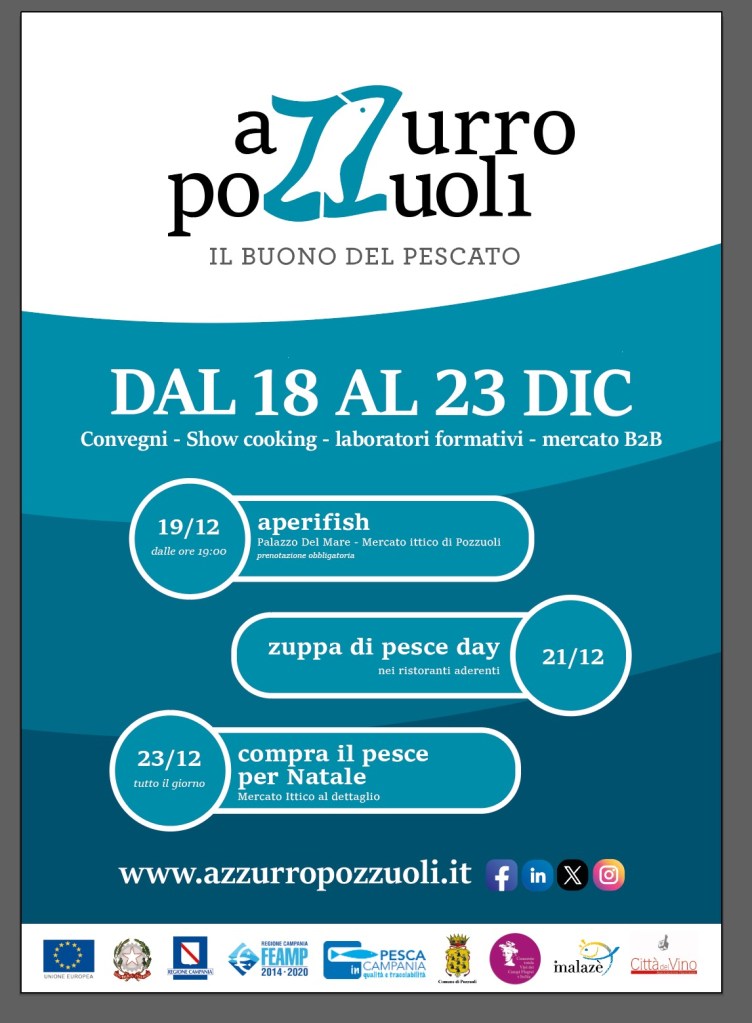 Pozzuoli (NA). Dal 18 al 23 dicembre la città di Pozzuoli ospiterà nel suo Palazzo del Mare, il mercato ittico all’ingrosso situato in via Nicola Fasano 17, la prima edizione di Azzurro Pozzuoli, kermesse dedicata alla tradizione della pesca pelagica, ecosostenibile e all’enogastronomia responsabile.