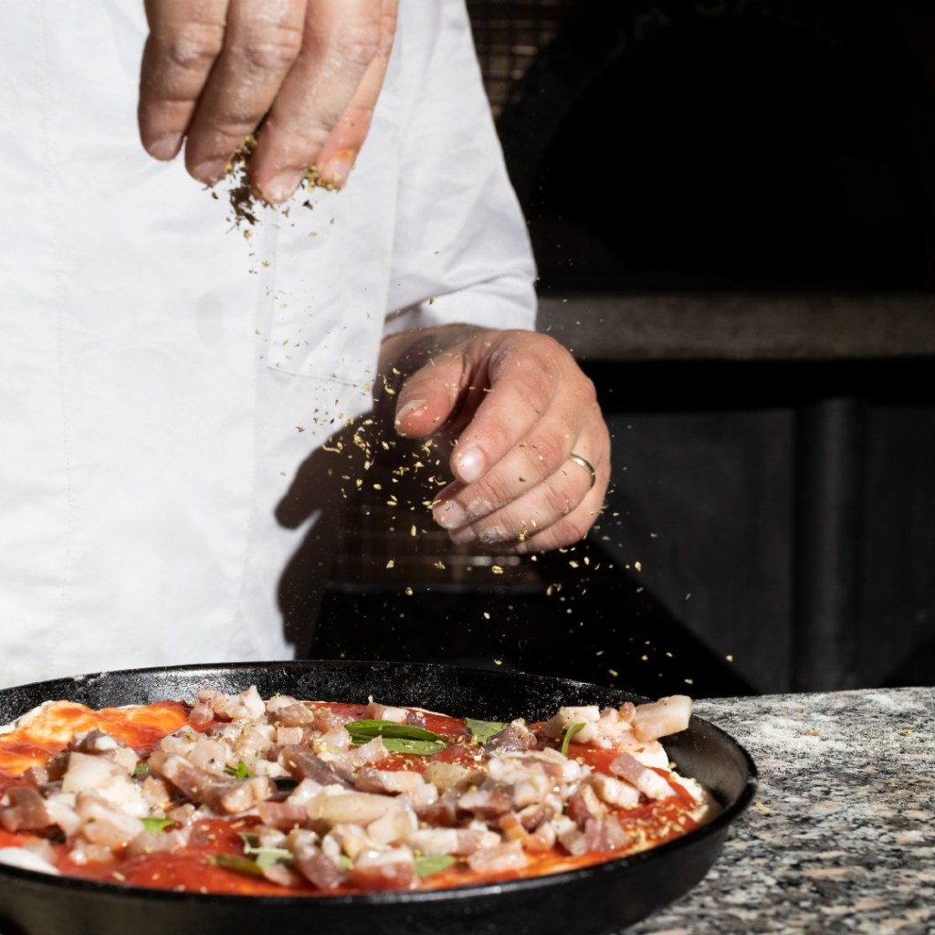 Carminuccio nel ruoto, si ma procediamo con calma. Chi è l’artefice di questa prelibatezza? Nome: Daniele, cognome: De Caro. Esattamente, Daniele De Caro è l’ideatore di O Sciore Pizzeria a Bivio Pratole di Montecorvino Pugliano, una pizzeria e ristorante fuori dalle guide, fuori dai riflettori, fuori dai meccanismi mediatici, ma dentro al cuore della gente, dentro ai ricordi di chi quando assaggia queste pizze non può fare a meno di sospirare dalla bontà e ritornarvi a provarle dieci, cento, mille volte. Daniele, salernitano DOC e tifoso agguerrito della Salernitana sin dalla tenera età, ha lavorato per molti anni in centro a Salerno in rinomate pizzerie. Poi dopo tanti sacrifici ha deciso nel 2021 di stabilirsi a Montecorvino Pugliano per inaugurare un locale di propria gestione a pochi metri dall’uscita del casello autostradale che fosse aperto a pranzo, con una proposta veloce da cambiare ogni giorno per avventori di passaggio (primo, secondo, acqua, caffè, coperto), e la sera funzionasse come pizzeria e hamburgeria d’eccellenza.