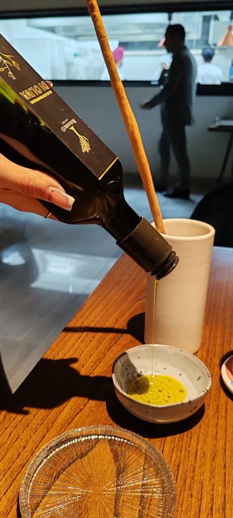 Un ristorante di alto livello che si rispetti ha sempre una carta dei vini e olii ben strutturata, inoltre pani, grissini e focacce devono essere tutti artigianali. Immediatamente, prima della degustazione, al tavolo sono stati serviti dall’impeccabile personale di sala i pani a lunga lievitazione con farine bio selezionate, grissini allo strutto, focaccia alle patate e cracker al rosmarino. L’olio da cultivar leccino, Rosanisco Lecru, è un extravergine proveniente dai territori molisani a cavallo tra Venafro e Pozzilli, un fruttato leggero molto profumato con note erbacee di media persistenza che non è andato a coprire i sapori, anzi li ha esaltati, facendo soprattutto riferimento a pesci e molluschi. Il vino scelto in abbinamento ai piatti è stato il rosato Vado Ceraso Terre del Volturno IGP 2022 dell’azienda agricola Vestini Campagnano, armoniosa fusione di uve Pallagrello Nero e Casavecchia in parti uguali, di colore rosa intenso, è riuscito a regalare un’esperienza gustativa di spessore e raffinatezza.