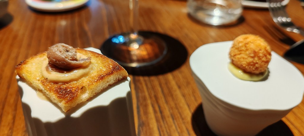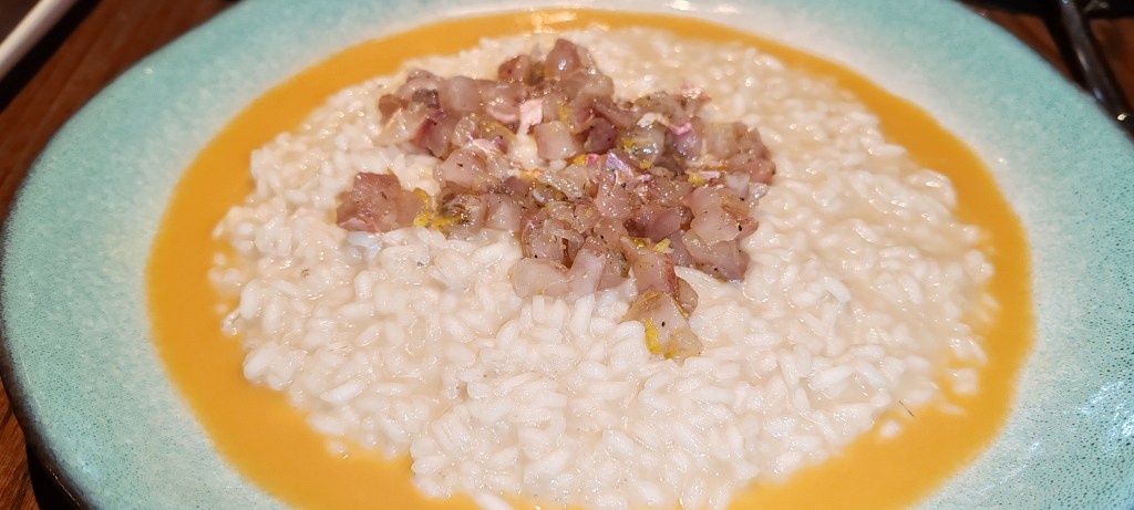 Come benvenuto lo chef ha proposto una polpettina di baccalà su maionese ai capperi e crostino all’olio con anacardo e acciuga. Golosi entrambi, particolare il secondo per l’accostamento di sapori. Ma chi ben inizia è sempre a metà dell’opera e quindi la degustazione è proseguita con un invitante antipasto composto da capesante, zucca, pancetta croccante e tartufo nero. La delicatezza dei pregiati frutti di mare, immersi nella dolcezza della crema di zucca è stata esaltata dalle note terragne del tartufo, dalla sapidità e croccantezza del salume. Il piatto è sembrato equilibrato e le varie consistenze sono risultate distinguibili e divertenti al palato. I colori hanno ricordato le installazioni della strabiliante artista giappnese Yayoi Kusama caratterizzate da un approccio distintivo e unico che combina elementi di diverse correnti artistiche, tra cui il surrealismo, l’astrattismo e la pop art.