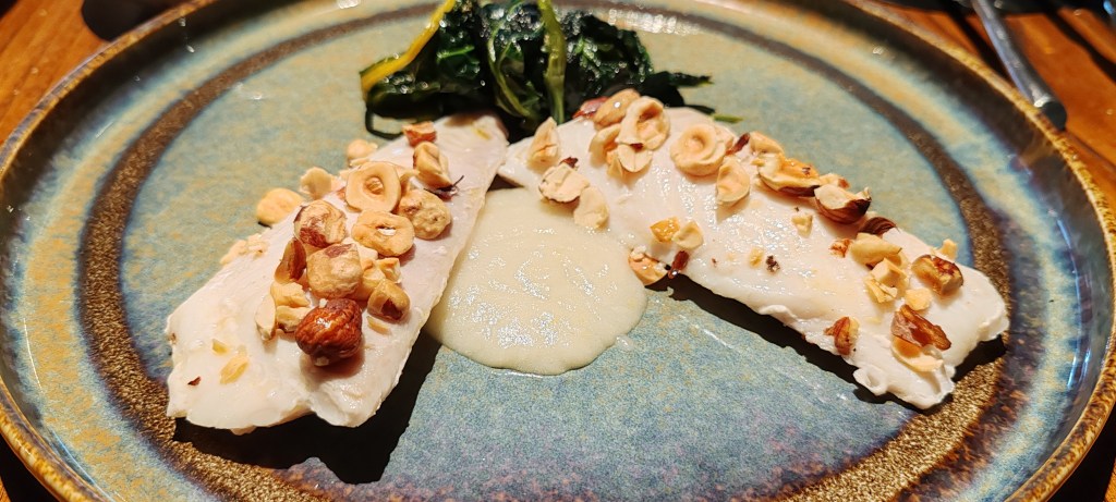 Non c’è due senza tre. La sogliola con nocciole e cavolo nero adagiata sul roux è stata semplicemente un secondo pazzesco, tre semplici ingredienti per un ensemble di grande complessità, charme e delicatezza che ha lasciato un segno profondo. L’assenza di distrazioni, causate talvolta da accostamenti bizzarri, ha permesso l’immersione totale nella portata, stimolando la riflessione e invitando a una connessione intima con l’essenziale.
