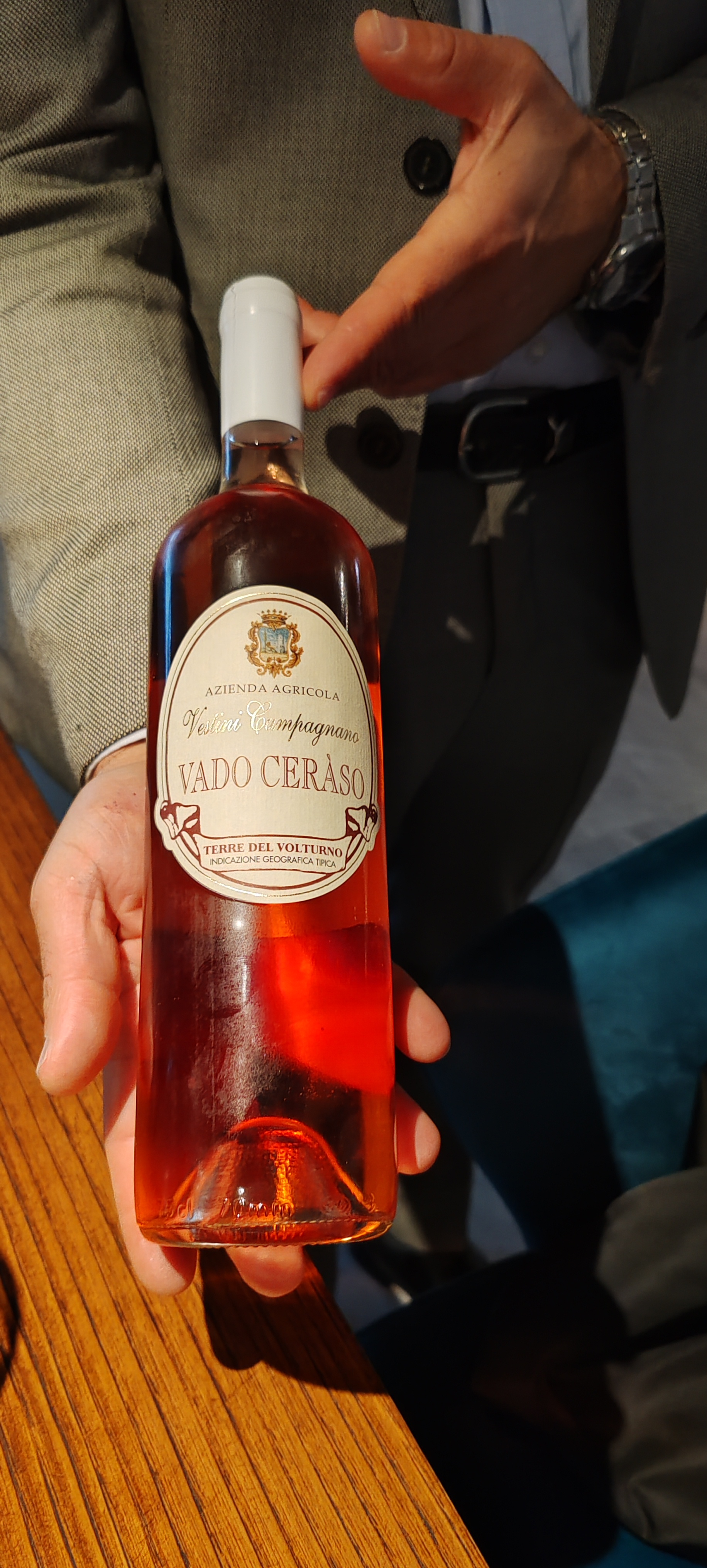 Un ristorante di alto livello che si rispetti ha sempre una carta dei vini e olii ben strutturata, inoltre pani, grissini e focacce devono essere tutti artigianali. Immediatamente, prima della degustazione, al tavolo sono stati serviti dall’impeccabile personale di sala i pani a lunga lievitazione con farine bio selezionate, grissini allo strutto, focaccia alle patate e cracker al rosmarino. L’olio da cultivar leccino, Rosanisco Lecru, è un extravergine proveniente dai territori molisani a cavallo tra Venafro e Pozzilli, un fruttato leggero molto profumato con note erbacee di media persistenza che non è andato a coprire i sapori, anzi li ha esaltati, facendo soprattutto riferimento a pesci e molluschi. Il vino scelto in abbinamento ai piatti è stato il rosato Vado Ceraso Terre del Volturno IGP 2022 dell’azienda agricola Vestini Campagnano, armoniosa fusione di uve Pallagrello Nero e Casavecchia in parti uguali, di colore rosa intenso, è riuscito a regalare un’esperienza gustativa di spessore e raffinatezza.