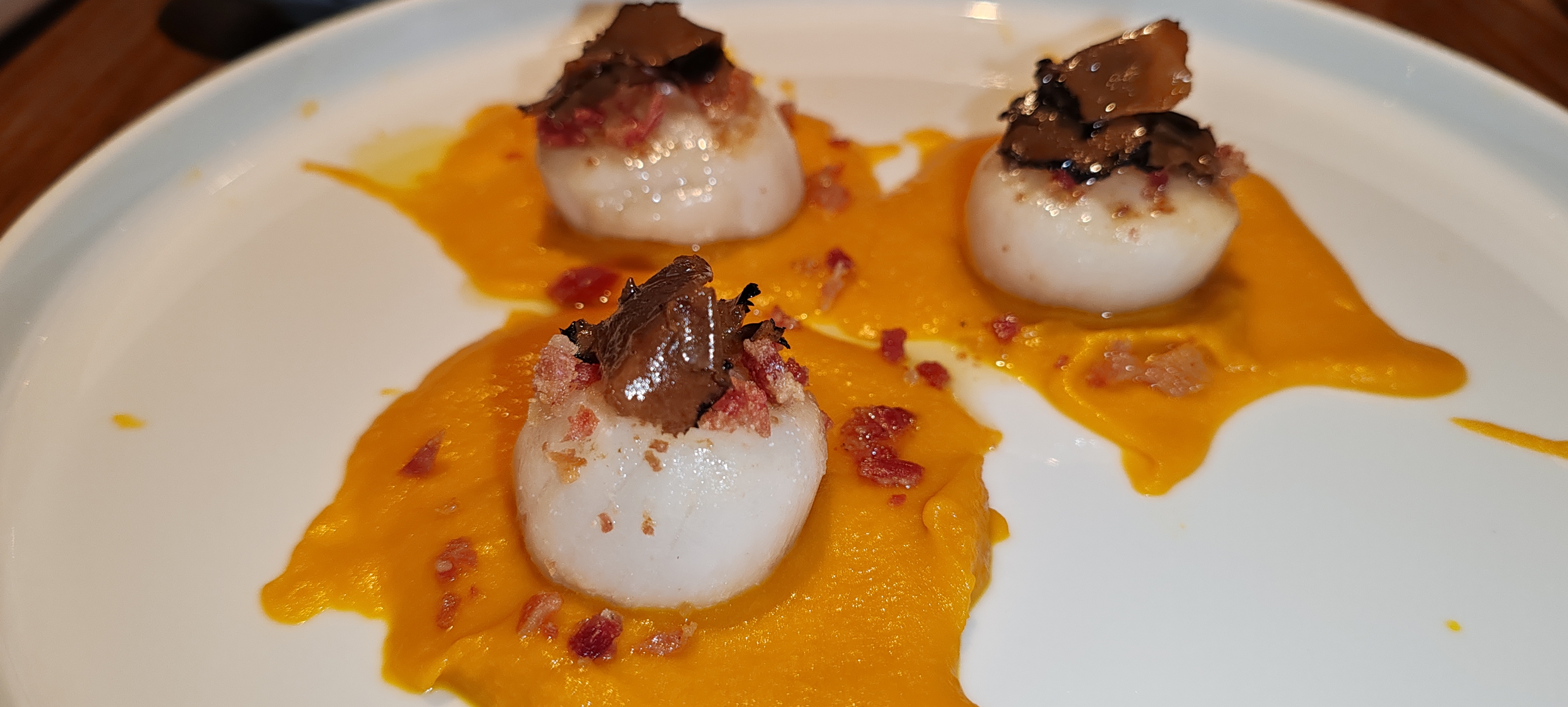 Come benvenuto lo chef ha proposto una polpettina di baccalà su maionese ai capperi e crostino all’olio con anacardo e acciuga. Golosi entrambi, particolare il secondo per l’accostamento di sapori. Ma chi ben inizia è sempre a metà dell’opera e quindi la degustazione è proseguita con un invitante antipasto composto da capesante, zucca, pancetta croccante e tartufo nero. La delicatezza dei pregiati frutti di mare, immersi nella dolcezza della crema di zucca è stata esaltata dalle note terragne del tartufo, dalla sapidità e croccantezza del salume. Il piatto è sembrato equilibrato e le varie consistenze sono risultate distinguibili e divertenti al palato. I colori hanno ricordato le installazioni della strabiliante artista giappnese Yayoi Kusama caratterizzate da un approccio distintivo e unico che combina elementi di diverse correnti artistiche, tra cui il surrealismo, l’astrattismo e la pop art.