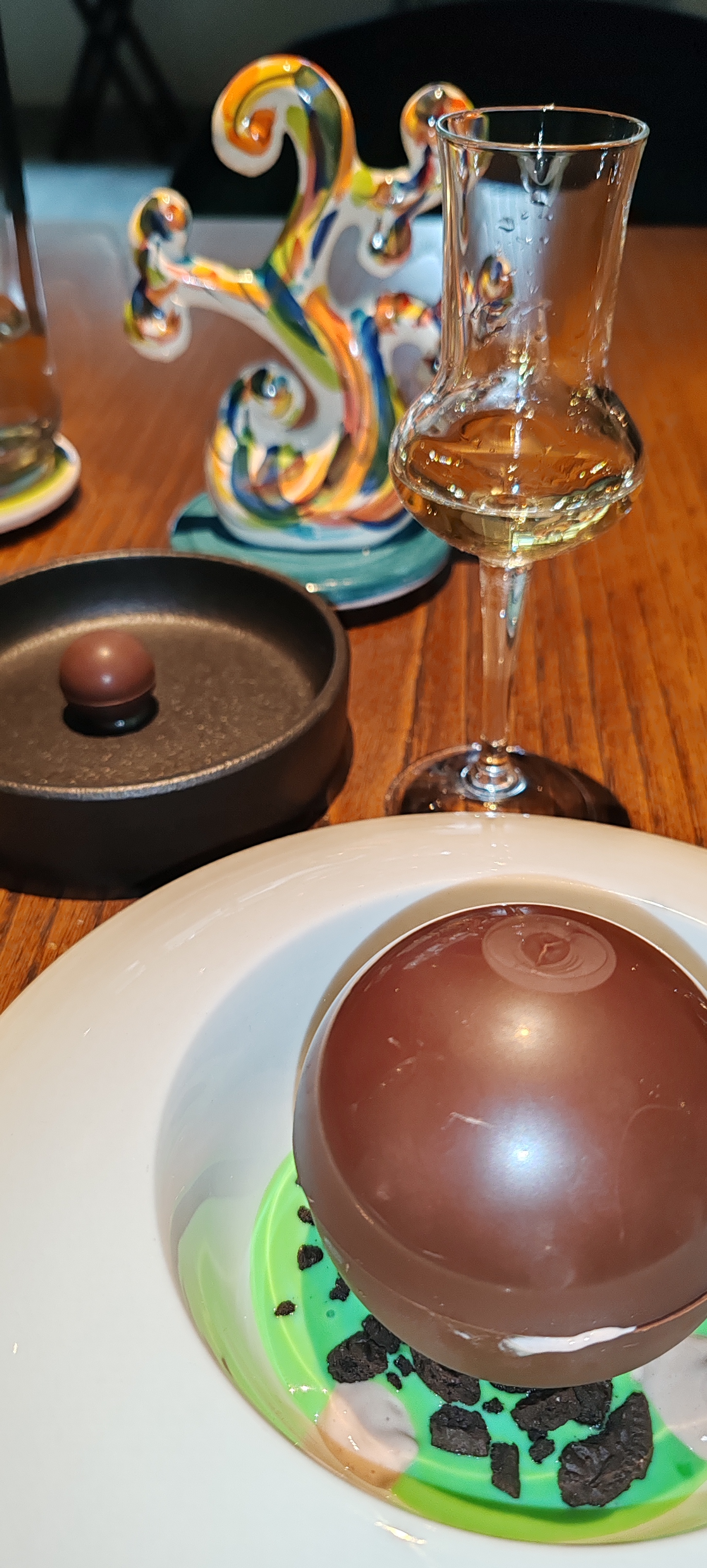 La sfera di cioccolato fondente con crumble al cacao, gelato al lampone e rosmarino si è dimostrata la degna conclusione di una cena spettacolare con la sua balsamicità, data dalla pianta aromatica, freschezza e gradevolezza non stucchevole. La sfera impreziosita da tonalità marroni, rosa e verdi ha fatto pensare immediatamente ad un’opera di mimetismo visivo, il cui punto focale è sottolineato da una sottile variazione nella disposizione degli elementi camouflage, creando una zona di maggiore intensità o contrasto. Questo punto di convergenza ha svelato una forma astratta o un dettaglio inaspettato, sfidando lo spettatore a esplorare attentamente l’opera commestibile e a scoprire ciò che è nascosto nella sua apparente omogeneità. Il mini cioccolatino sferificato con purea di mango e passion fruit è stato la coccola finale e il saluto amichevole dello chef.